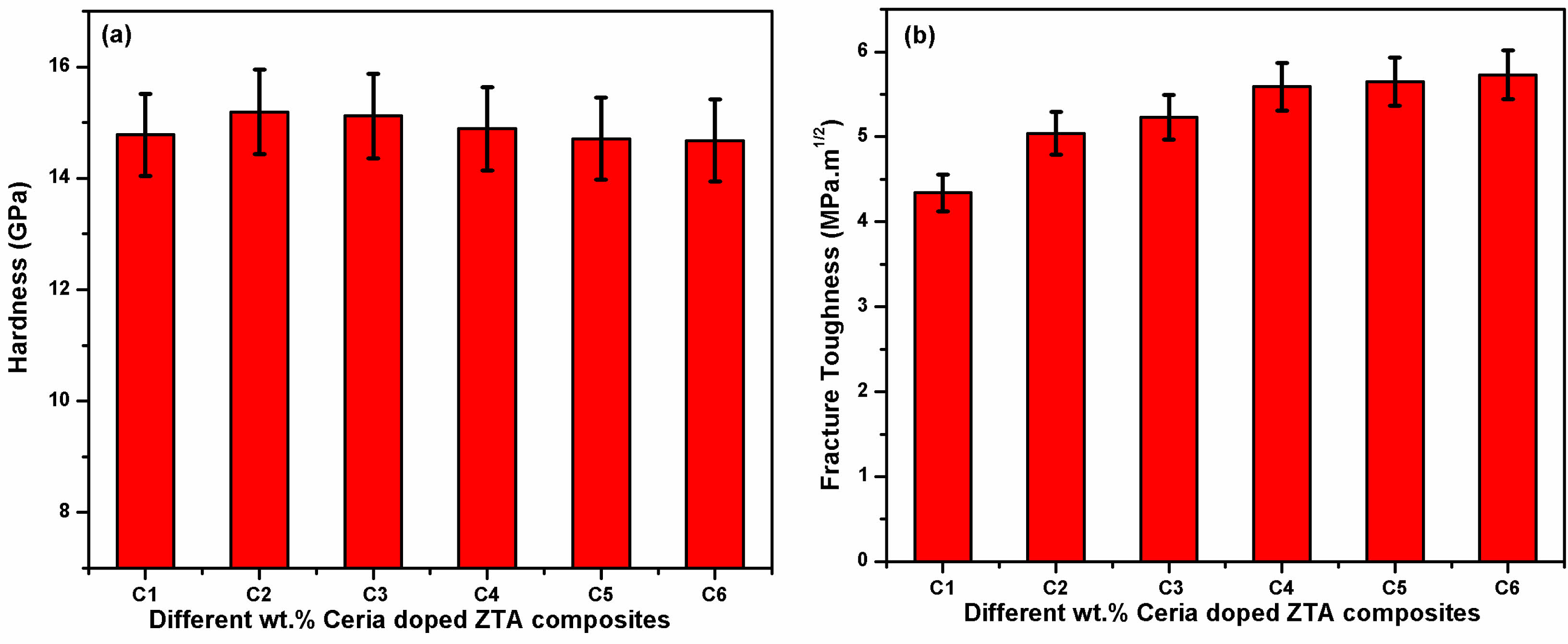 After analysis of bulk density, the micro hardness and indentation toughness for all composites are evaluated on Vickers hardness tester. The evaluated values of hardness and toughness are summarized through bar chart in Fig. 6(a) and (b).
