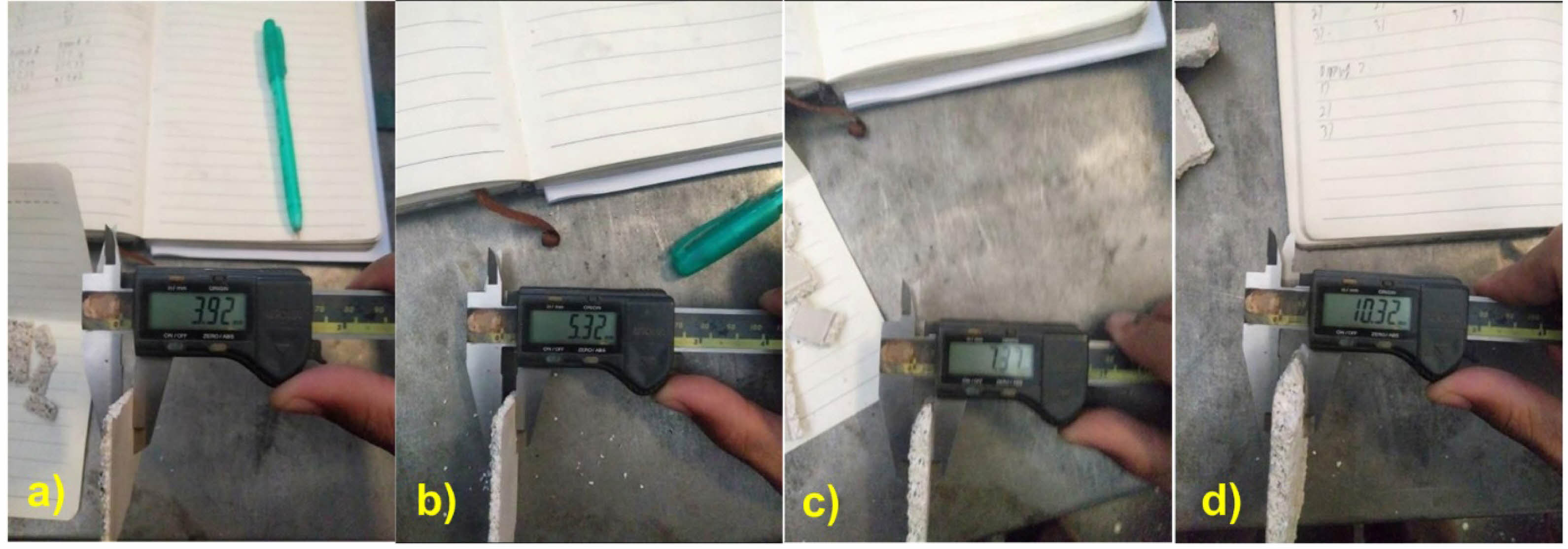 Fig. 1 Measurement of layer thickness, a) 4th layer; b) the 5th layer; c) the 6th layer; d) 7th layer  |