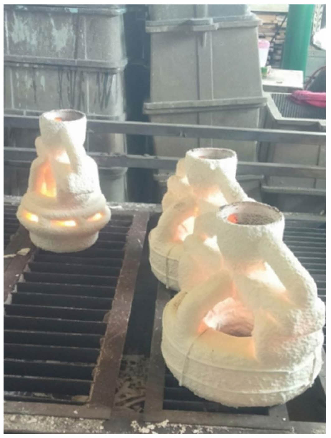 Sintering the ceramic shell mold hardens the ceramic material. The sintering process aims to produce a hard ceramic shell that is resistant to heat, pressure, and high temperatures during metal casting. The sintering temperature for the ceramic shell in this investment casting study was set at 1050 °C. This temperature was applied after the wax pattern was melted.