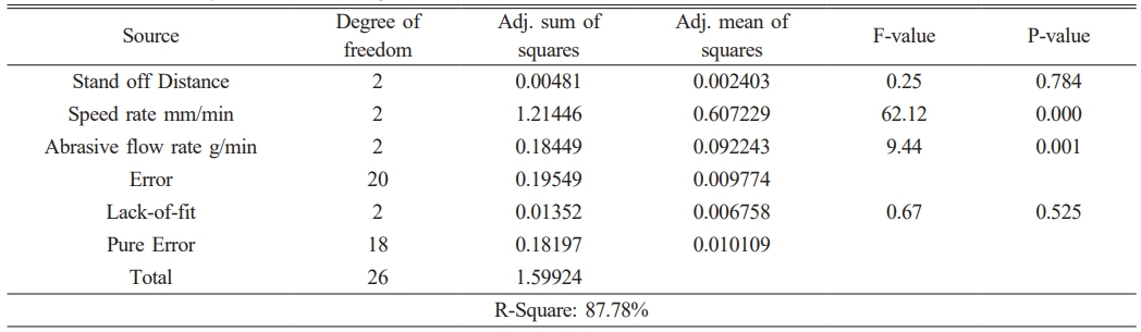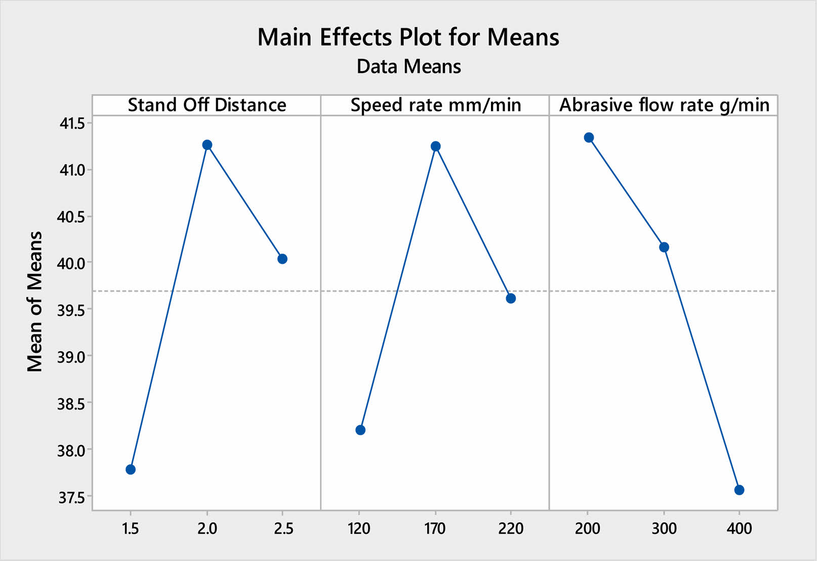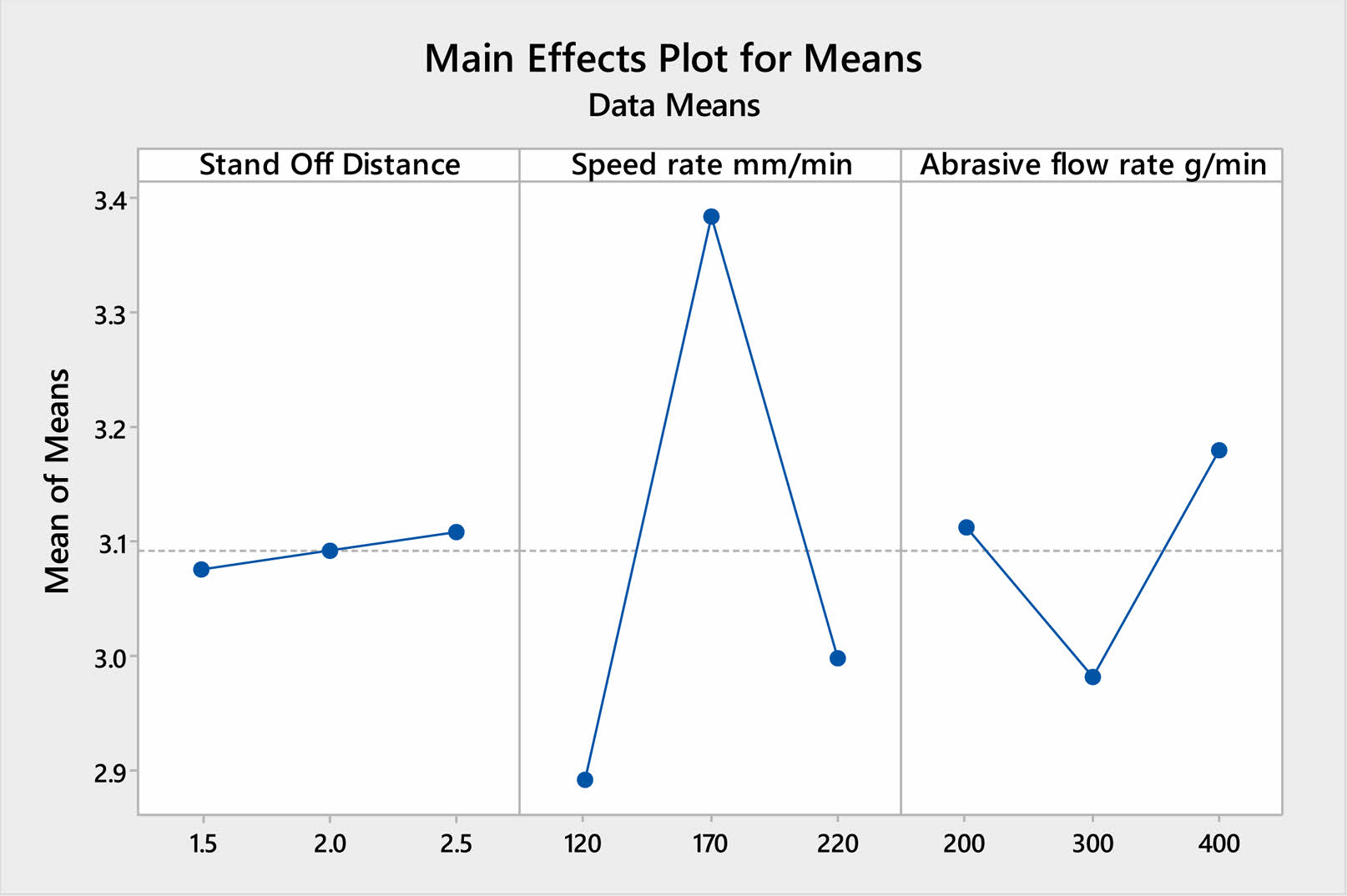 The ANOVA analysis for Kerf is carried out and it is observed that stand off distance and abrasive flow rate are the high influencing parameter in minimizing the kerf while machining MONEL K500 and it is followed speed rate. The R-square value of the ANOVA analysis is found to be 88.52% and it is highly acceptable. The ANOVA tables of surface roughness, material removal rate and Kerf are presented in Tables 4-6 respectively. R-square value represents the proportion of the response variability with respect to the factors and interaction of the factors considered as the process parameters in AWJM. 80-85% of R-square value denotes process variability can come from minor changes in the abrasive quality, environmental changes, measurement errors, vibration and so on. This value also depicts the model is highly significant and acceptable. The main effects plots for means for SR and MRR are shown in Fig. 2 and Fig. 3. respectively.