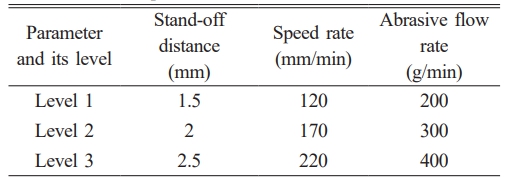 The primary objective of this research work is improving the process parameters of abrasive water jet machining for machining MONE K500. The experiments were conducted on OMEX 5555 jet machining centre. Three factors and three levels are chosen and the process parameters considered in this work are SOD, SR and AFR. The parameters and its level are presented in Table 2. In this work, stand off distance, speed rate and abrasive flow rate are considered as the process parameters for machining Monel K500 using abrasive water jet machining process. The other parameters which influence the machining of Monel K500 includes; tool material, depth of cut, feed rate, and so on. The stand-off distance, speed rate and abrasive flow rate are considered in this work. Since these responses are considered to the primary influencial parameter in AWJM process, they are selected in this work. These parameters will reduce experimental complexity and consistent with industrial applications. The other parameters such as water pressure, nozzle geometry, abrasive grit size are not considered because it provides less influence in the machining of Monel K-500.