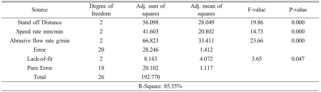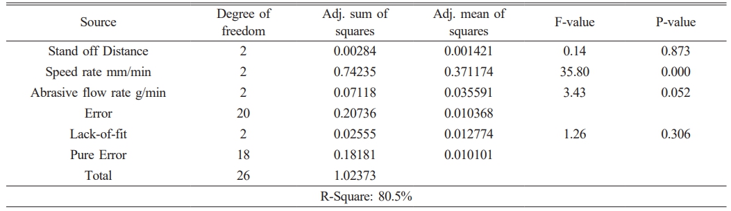 ANOVA analysis is useful in predicting the influence of the process parameters on the quality characteristics. F-value and p-value are used to study the significance of the process parameters on the response variables. In this work ANOVA analysis is carried out for all response to determine the dominant process parameters on machining of MONEL K500 using abrasive water jet machining. The ANOVA analysis for SR is carried out and it is observed that speed rate is the high influencing parameter in minimizing the surface roughness while machining MONEL K500 and it is followed with Abrasive flow rate and stand off distance. The R-square value of the ANOVA analysis is found to be 87.78% and it is highly acceptable. The ANOVA analysis for MRR is carried out and it is observed that stand-off distance, speed rate and abrasive flow rate are the high influencing parameter in maximizing the material removal rate for machining MONEL K500. The R-square value of the ANOVA analysis is found to be 85.35% and it is highly acceptable.