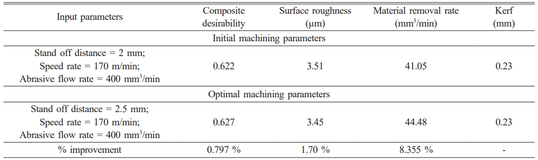The individual desirability function for the SR, MRR and kerf are determined by assigning equal weightage to all the responses equally. Giving equal weightage to all the responses means, no single response is prioritized at the expense of the other. It provides a neutral optimization application allowing customization for all industrial applications. The composite desirability can be obtained without any bias by providing equal weights to all the responses. The composite desirability is computed and the optimum cutting parameters are determined. The higher the composite desirability, the better the quality conditions and it gives the optimal machining conditions. From Table 7, the higher composite desirability value is found to be 0.622 and the parameters against this value will provide the best optimum results. The values of composite desirability are ranked and higher the composite desirability, the value is ranked as ‘1’. The optimum input parameters for machining of MONEL K500 in abrasive water jet machining are computed as, standoff distance = 2 mm, speed rate = 170 mm/min and abrasive flow rate = 400 g/min. The composite desirability obtained for this combination is 0.622 and with these optimum levels, the surface roughness = 3.51 µm, material removal rate = 41.05 mm3/min and kerf = 0.23 mm. The validation of these parameters are performed and presented in Table 7.