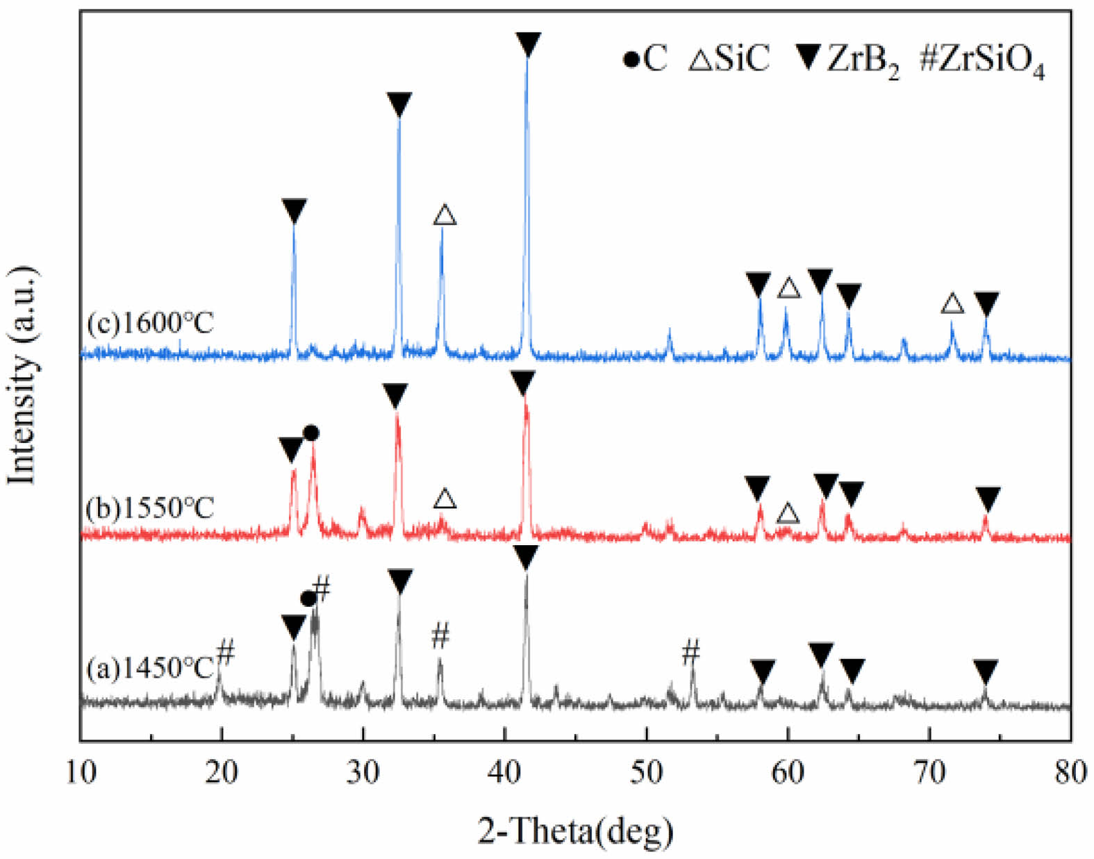 Fig. 1 presents the XRD patterns of powders synthesized under argon at 1450 °C, 1550 °C, and 1600 °C (1 h hold), demonstrating the significant influence of calcination temperature on phase composition. At 1450 °C, diffraction peaks correspond to residual carbon (C), intermediate zircon (ZrSiO4), and zirconium diboride (ZrB2), indicating partial reaction of ZrO2 with SiO2 forming ZrSiO4 and with C yielding ZrB2. As temperature increased, ZrSiO4 peak intensity gradually decreased and eventually disappeared by 1550 °C, signifying its decomposition, while ZrB2 peak intensity concurrently increased. At 1550 °C, only strong C and ZrB2 peaks accompanied by weak silicon carbide (SiC) peaks were observed; the absence of ZrSiO4 confirms its complete decomposition, while the presence of SiC signals the onset of carbothermal reduction between SiO2 and C. At 1600 °C, the pattern exclusively displays characteristic SiC and ZrB2 peaks with no detectable impurities, confirming complete carbothermal reduction. These findings collectively demonstrate that a 1600 °C hold for 1 h enables full reaction progression, successfully yielding high-purity SiC-ZrB2 composite powders.