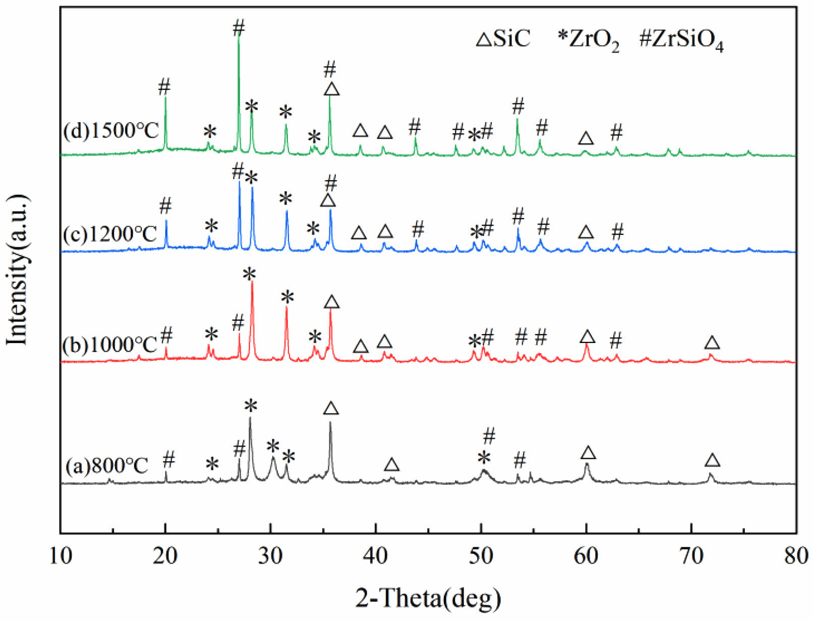 Oxidation behavior analysis revealed temperature-dependent transitions: At 800 °C, ZrB2 fully oxidized to ZrO2 while partial SiC oxidation yielded ZrSiO4. By 1000 °C, increased ZrO2 content and progressive SiC oxidation occurred alongside incipient powder sintering. Above 1200 °C, intensified SiC oxidation and accelerated sintering formed hardened agglomerates. Notably, at 1500 °C, SiC maintained structural stability-demonstrating significantly superior oxidation resistance compared to ZrB2 under equivalent conditions.