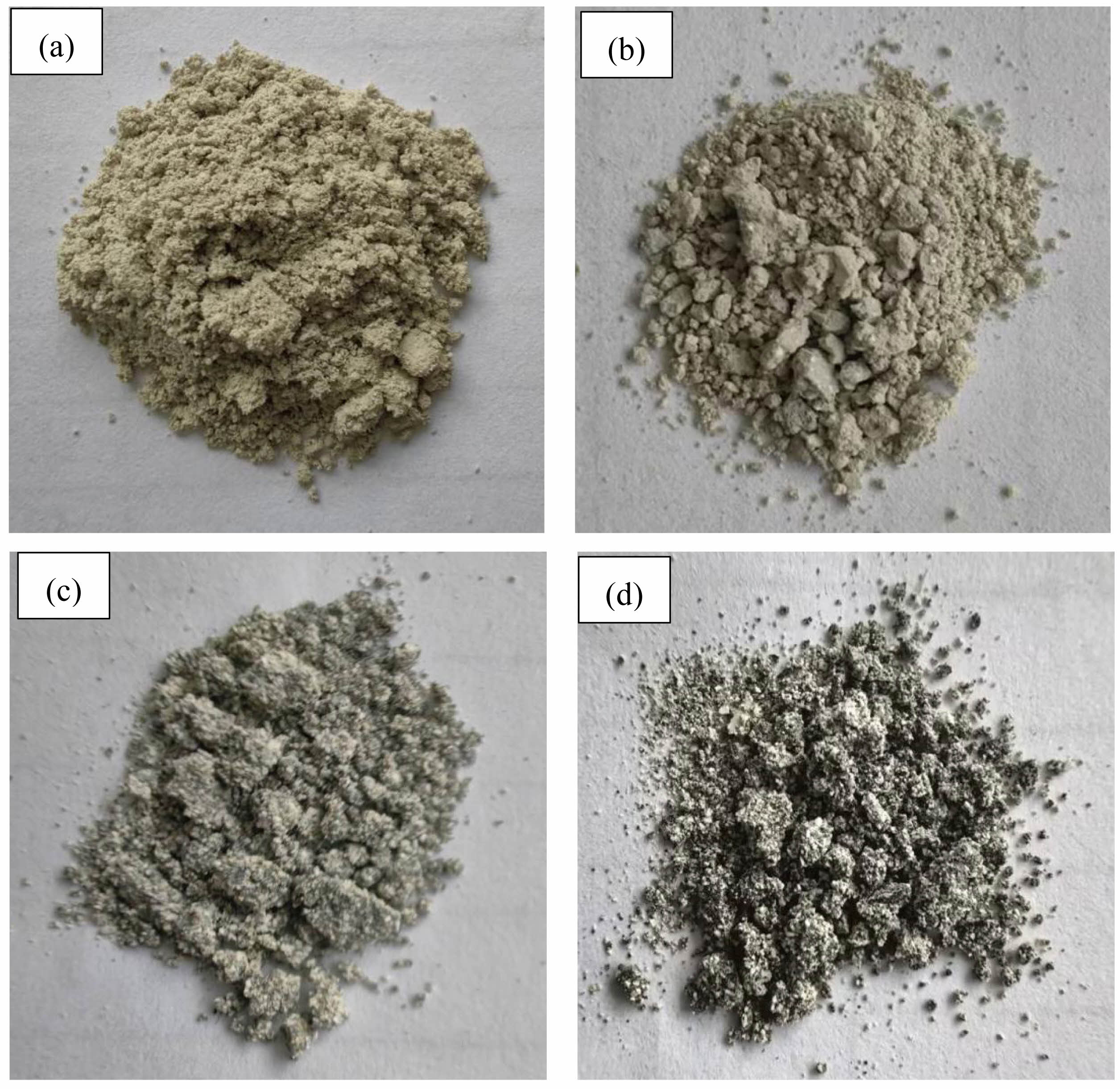 Fig. 5 Macroscopic morphology of SiC-ZrB2 composite powders after 30-min oxidation at: (a) 800 °C, (b) 1000 °C, (c) 1200 °C, (d) 1500 °C.  |