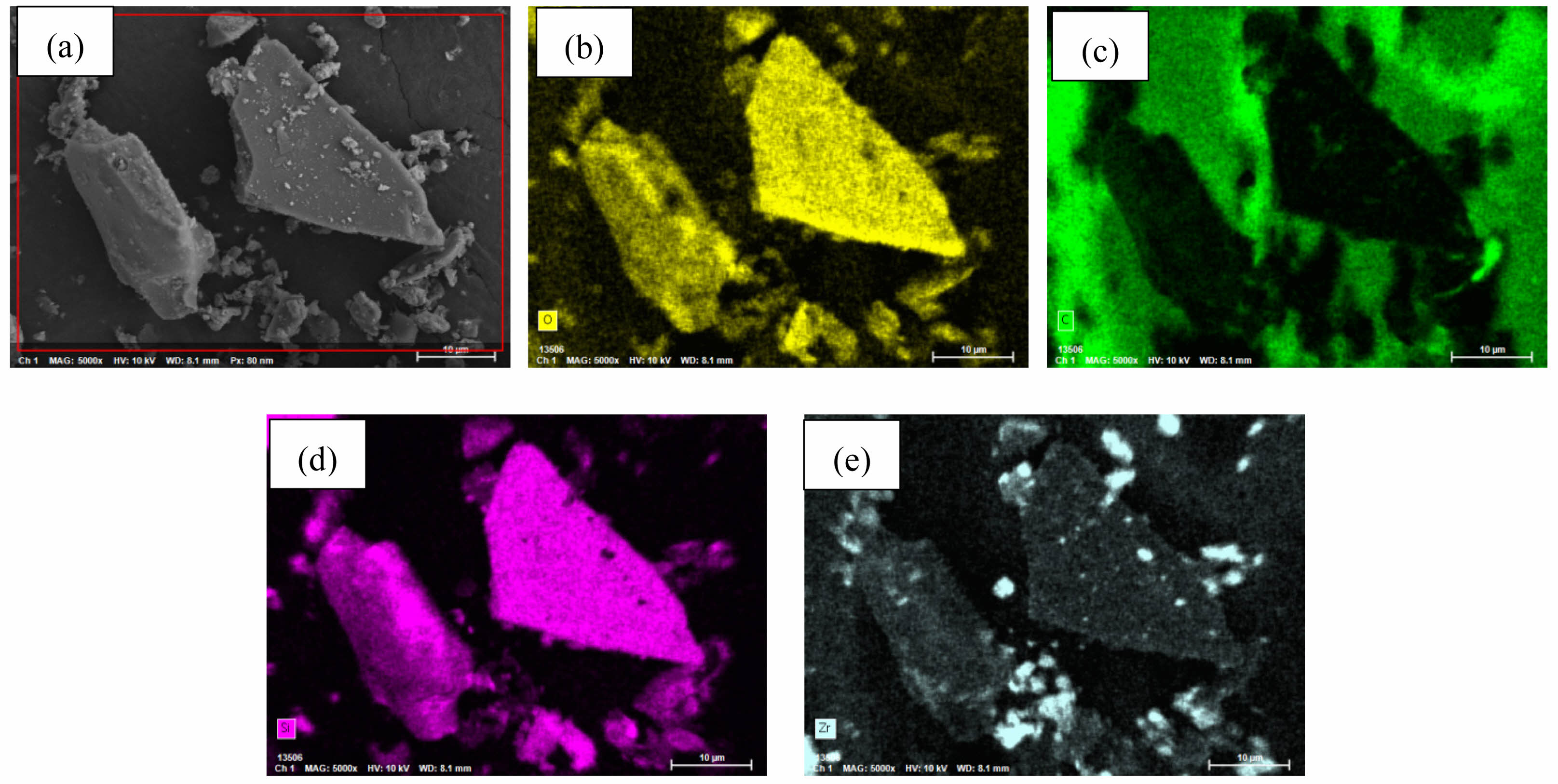 Figs. 7 and 8 present EDX elemental mapping of SiC-ZrB2 composite powders oxidized at 1000 °C and 1500 °C, respectively. Table 3 quantifies elemental mass percentages from EDX mapping at these temperatures. Both samples contained carbon (C), oxygen (O), silicon (Si), and zirconium (Zr), but exhibited no detectable boron (B), confirming complete ZrB2 oxidation to ZrO2 and volatile B2O3. Comparative analysis reveals significantly diminished carbon content at 1500 °C (Fig. 8b) versus 1000 °C (Fig. 7b), indicating intensified SiC oxidation at elevated temperatures. These EDX results align with XRD phase analysis and SEM microstructural observations, demonstrating technique-consistent oxidation behavior.