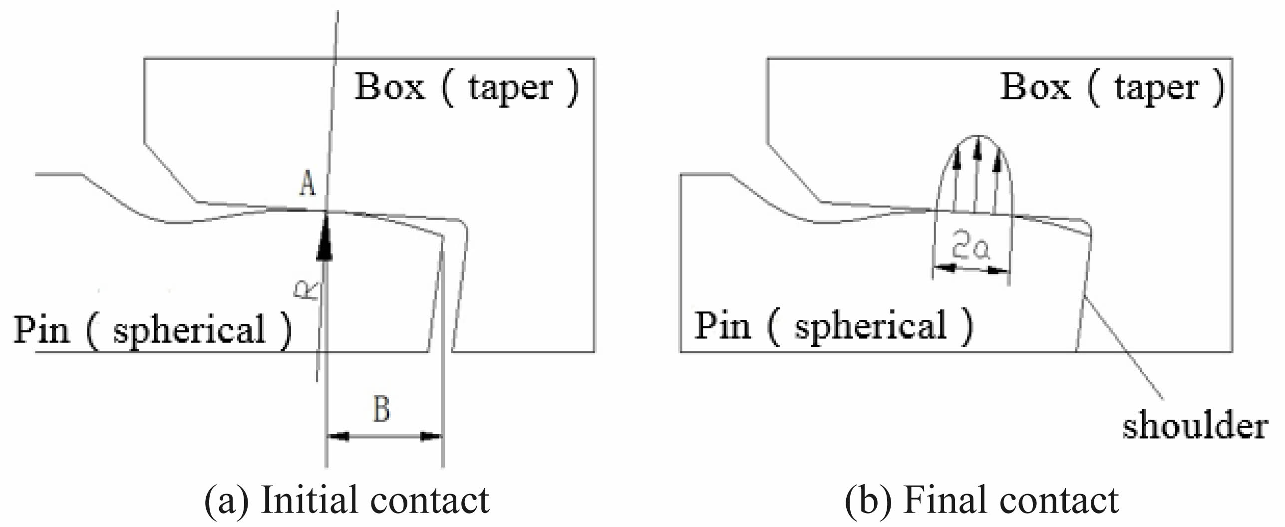 As can be seen, with the known mechanical properties of the material and the radius R of the sealing spherical surface, it is easy to calculate the contact width and seal surface interference of the spherical/tapered seal of the premium threaded joint using Hertz theory in the Fig. 5. Furthermore, it is possible to obtain the value of the load generated by the contact width on the sealing surface and the size of the interference between the spherical/tapered surface.
