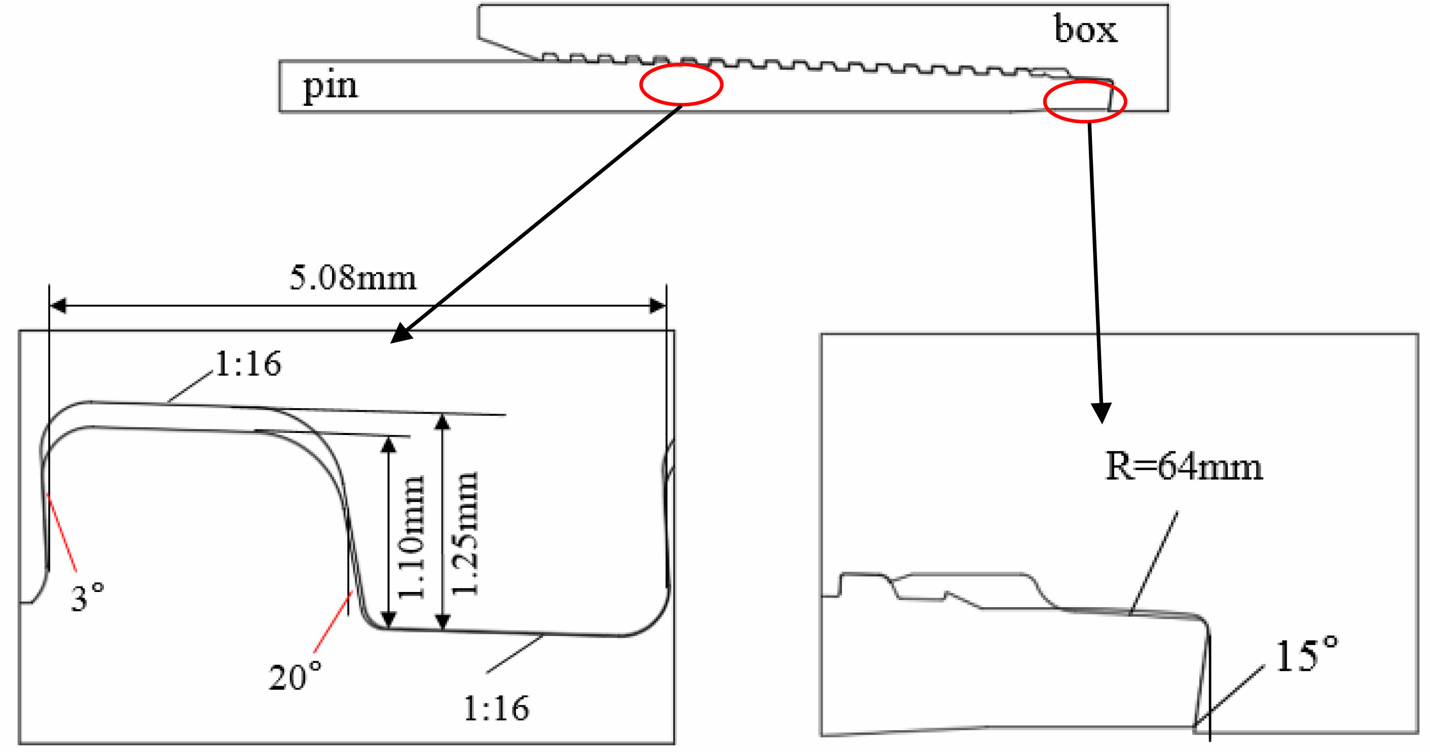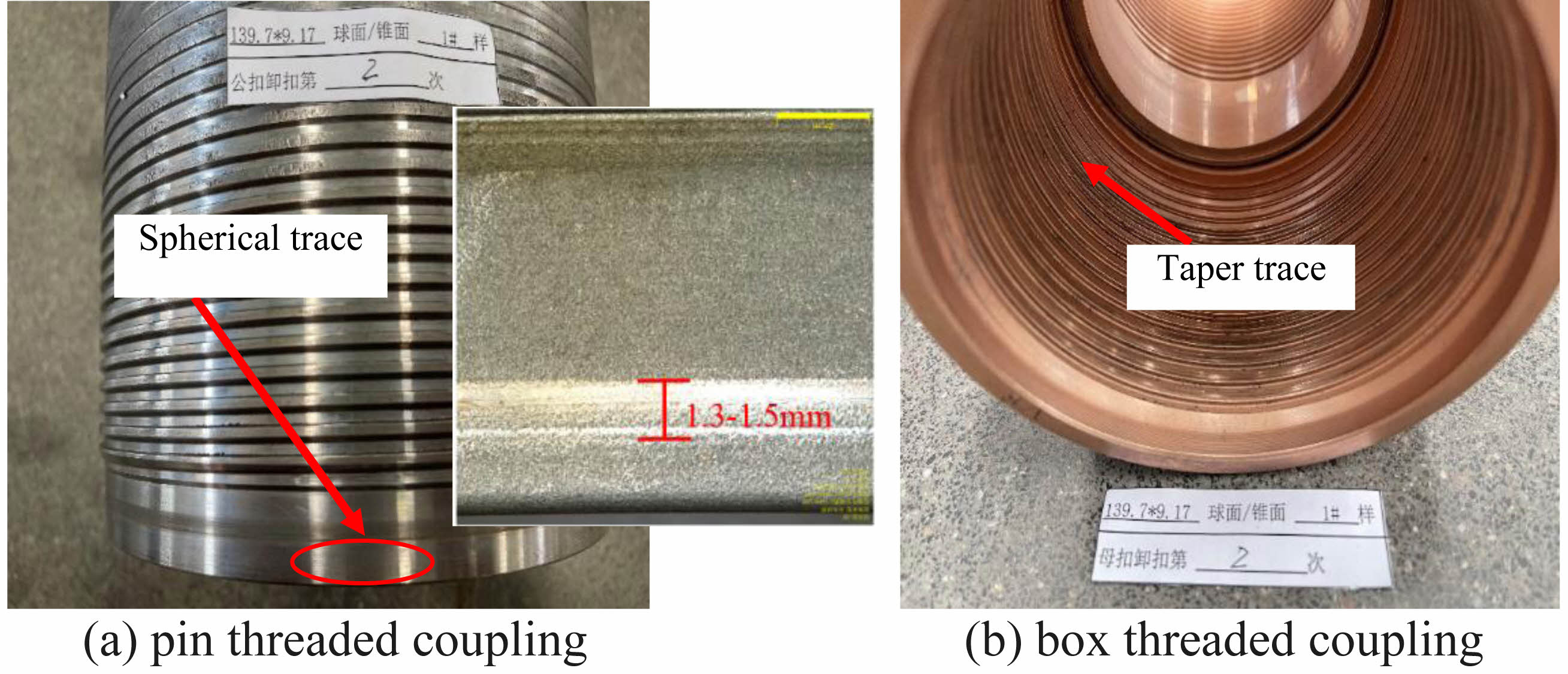 Two pairs of premium threaded joints of Φ139.7×9.17 mm P110 steel grade (including two each of pin and box threaded joints) were machined by CNC machine. The sealing surface of the box thread is tapered with a taper of 1:16, and the sealing surface of the pin thread is spherical with a spherical radius of R=64 mm, and the spherical surface is tangential to the tapered surface after tightening with an interference of 0.10 mm.