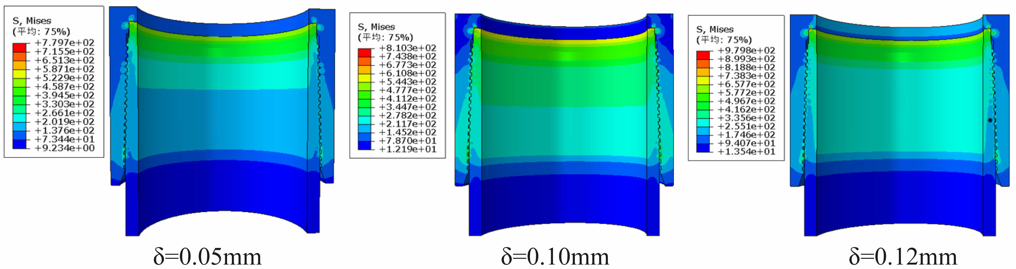 The friction between the threads, sealing surface and shoulder surface was simulated using the Coulomb model, and the friction coefficient was taken as 0.02 [16]. The material of the coupling and the pipe body are the same, with modulus of elasticity 2.1×105 MPa, Poisson's ratio 0.3, yield strength 758 MPa, tensile strength 980 MPa, and elongation 15%. According to the test results, the interference between the inner and outer threads is 0.1±0.06 mm to ensure that the torque shared by the threads accounts for 30-60% of the total torque, so the model takes a nominal interference of 0.05mm and keeps it constant. According to the calculation result of Hertz theory, the maximum interference of the spherical/tapered surface is 0.12 mm, beyond which the seal surface will show local yielding. Therefore, the finite element model sets the interference between the sealing spherical and tapered surfaces to 0.05, 0.10 and 0.12 mm, respectively in the Fig. 8 and Fig. 9. Studying the contact length and contact pressure distribution of the sealing surfaces under such interference, the calculation results are shown in Fig. 10.