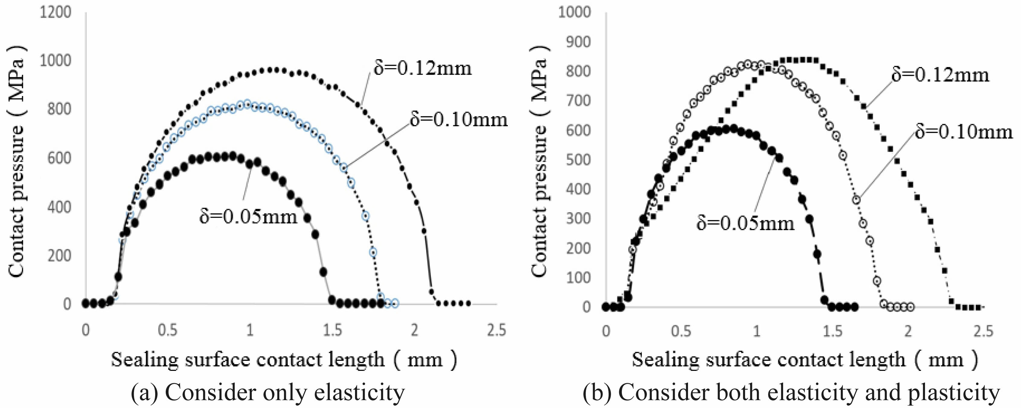 Considering the elasticity and plasticity of the material at the same time, the calculation results are shown in Fig. 10b. When the overfilling amount of the sealing surface is 0.05 mm, the contact pressure distribution curve is the same as Fig. 10a, and the material is in the elastic range. When the seal surface overfill increases to 0.10 mm, the contact pressure distribution curve is also basically the same as Fig. 10a. It excepts that the curve on the left side crosses with the overfill amount equal to 0.05 mm, indicating that local yielding of the seal surface occurs, but the seal surface contact width is basically unchanged, still about 1.54 mm, indicating that the yielding area is small. Compare the maximum contact pressure of Fig. 10b with that of Fig. 10a: In Fig. 10a, the maximum contact pressure of the curve with a seal overfill of 0.10 mm is 819 MPa, and in Fig. 10b, the corresponding maximum contact pressure is 822 MPa, which basically remains the same. Continuing to increase the seal surface overfill to 0.12 mm, the contact pressure also continues to increase if material yielding is not considered (in Fig. 10a). If yielding is considered, the maximum contact pressure is 840 MPa, which is only 18 MPa greater than the 822 MPa at 0.10 mm overfill, indicating that significant yielding of the seal surface has occurred at this time.