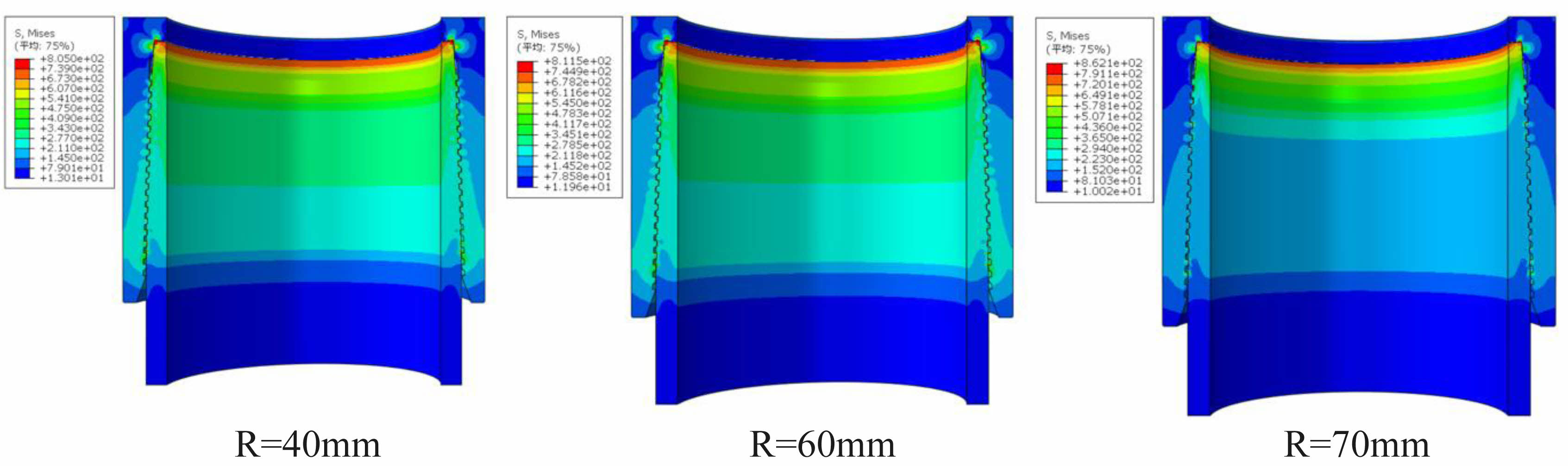 For the premium thread, the integral of the contact pressure along the contact length on the metal sealing surface is generally defined as the sealing strength, and the greater the sealing strength the better the sealing effect [15]. After obtaining the contact length and critical contact pressure of the spherical/tapered seal structure, the seal strength magnitude can be estimated. After setting different R values for repeated comparisons, the design parameters for the Φ139.7 × 9.17 mm CBS4 premium threaded spherical/tapered structure were determined as follows: spherical radius R = 64 mm and interference δ = 0.1214 mm.