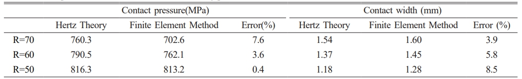 To further verify the reliability of the spherical/tapered seal structure using Hertz theory, the contact pressure and critical contact width of the seal surface were calculated using Hertz theory and the finite element method for spherical radii R=70, 60, and 50 mm, in the Fig. 11. The calculation results are shown in Fig. 12 and Table 1.