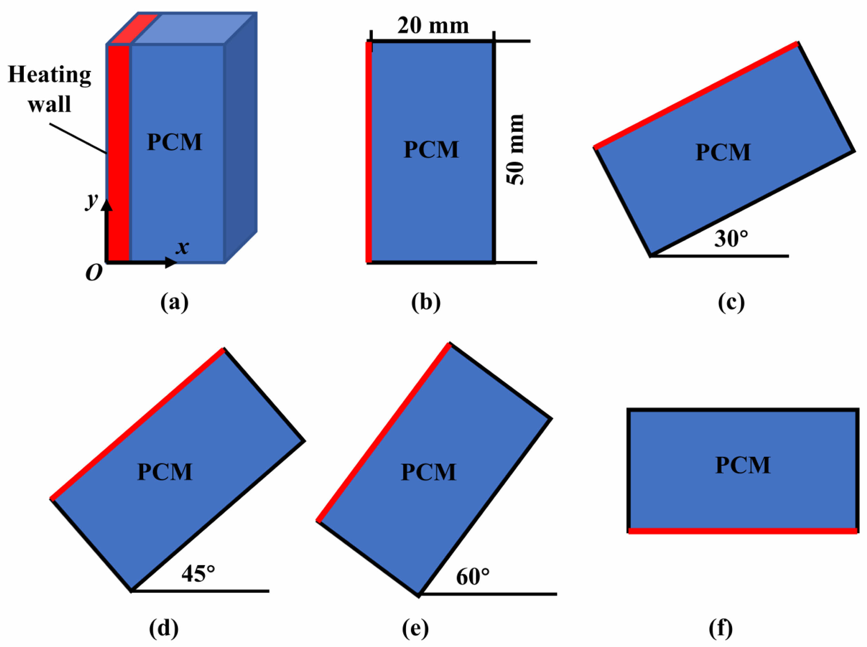 The heat storage unit has a heating surface and a phase change heat storage cavity. The cavity is 100 mm long and 50 mm wide. The heating surface is on its left side. Wax has been chosen as the PCM for the heat storage process. These properties are listed in Table 1. The main aim of this study is to look into the melting process inside the heat storage device. This will be done under different heating boundary conditions and inclination angles. To achieve this, a bunch of numerical simulations have been carried out. The details of these simulations are summed up in Table 2.