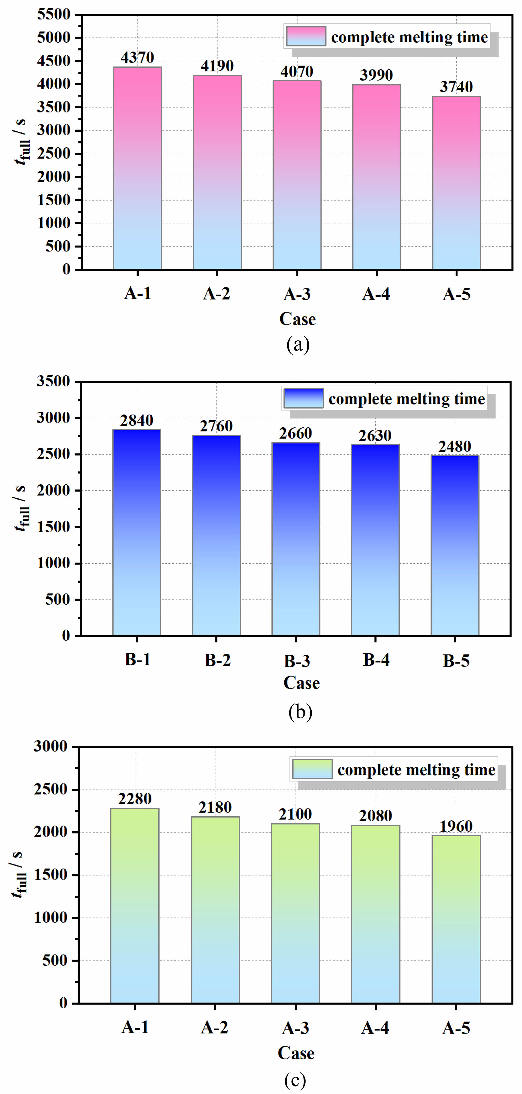Figure 3(c) displays the complete melting times of the devices under a 6000 W heating surface. The optimal configuration is Case C-5, which exhibits a 14.05% reduction in complete melting time compared to Case C-1. Therefore, the three different heating surfaces exhibit the same trend: the complete melting time of thermal storage devices with a 90° inclination angle is shortened by more than 10% compared to those with a 0° inclination angle.