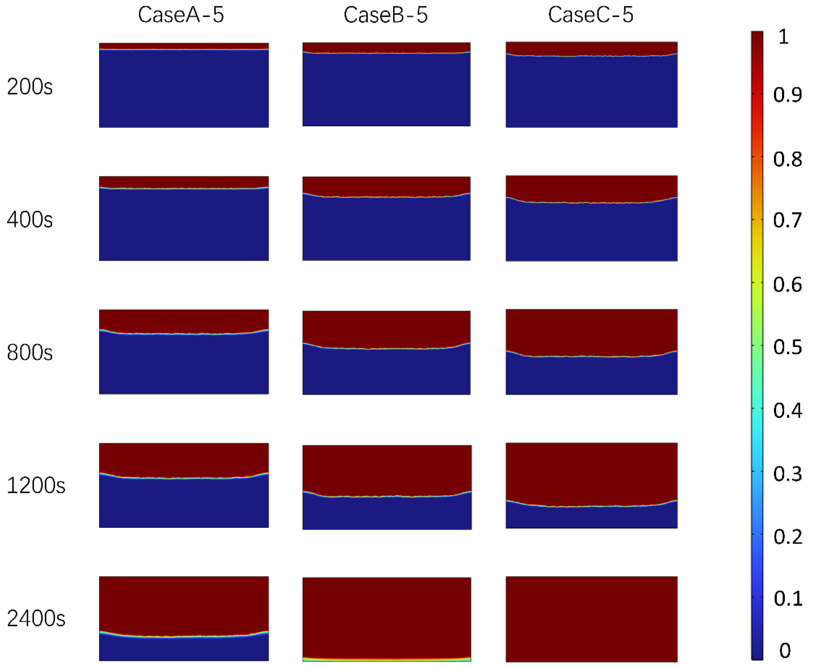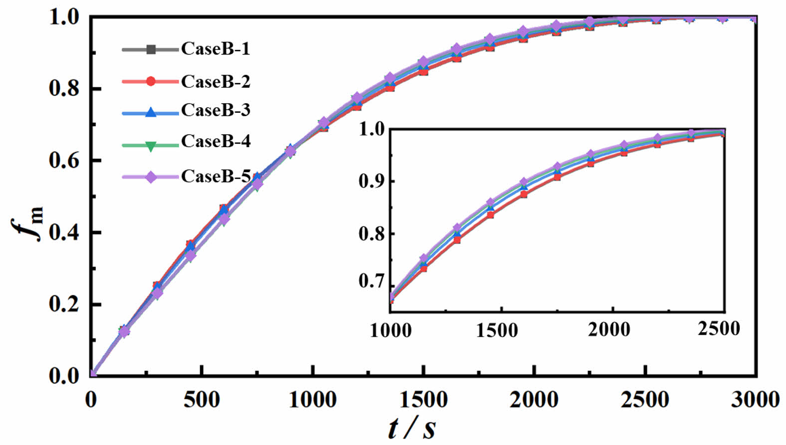 In Fig. 3(b), Case B-1 represents a thermal storage device with a 0° inclination angle under a 4000 W heating surface, with a complete melting time of 2840 seconds. Similarly, the shortest complete phase change time occurs at a 90° inclination angle, which is only 2480 seconds, representing a 12.67% reduction compared to Case B-1. Additionally, the melting rates of the PCTES devices with inclination angles of 30°, 45°, and 60° compared to the 90° inclination angle also increase, with complete melting times shortened by 2.81%, 6.33%, and 7.39%, respectively.