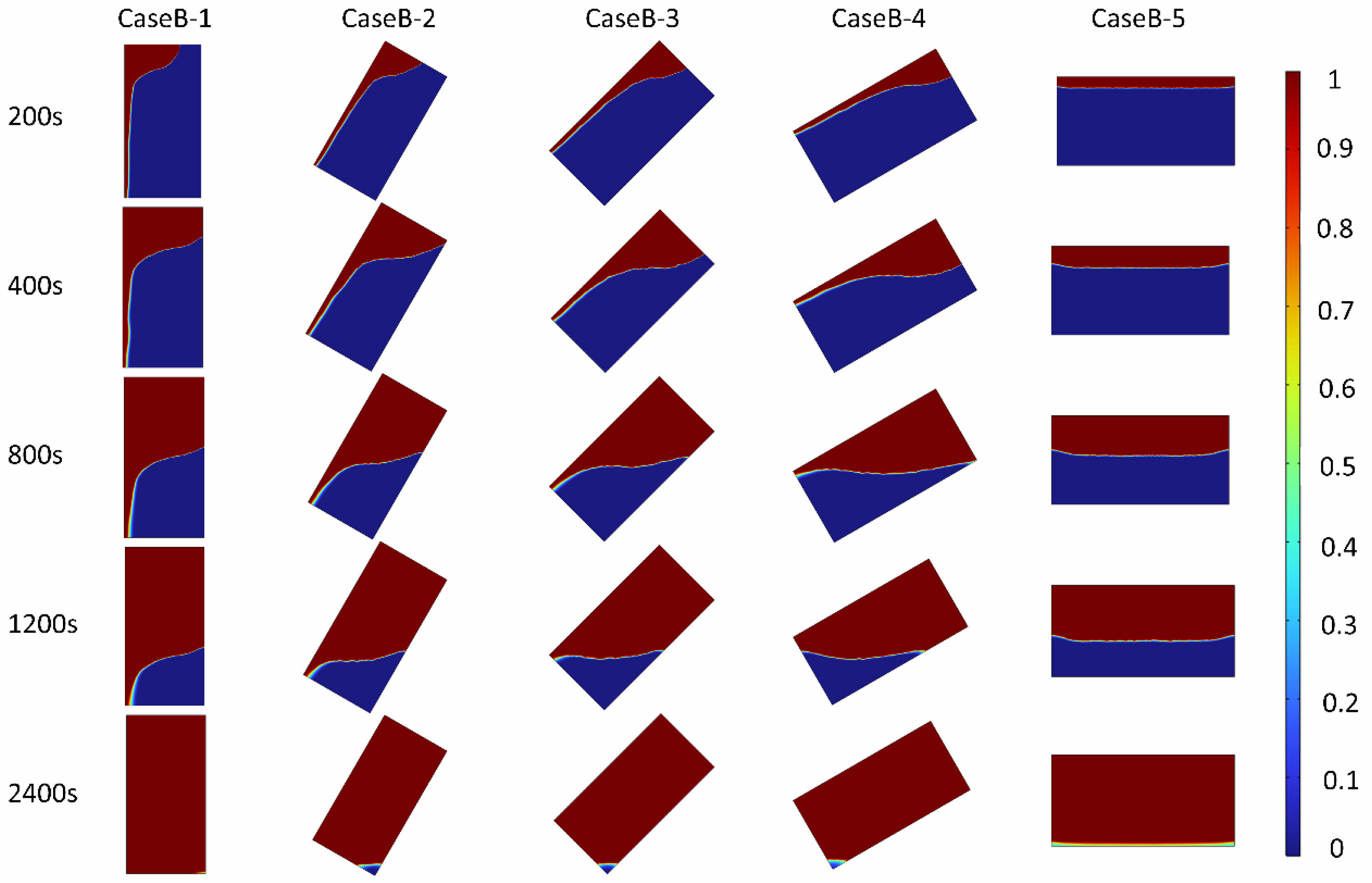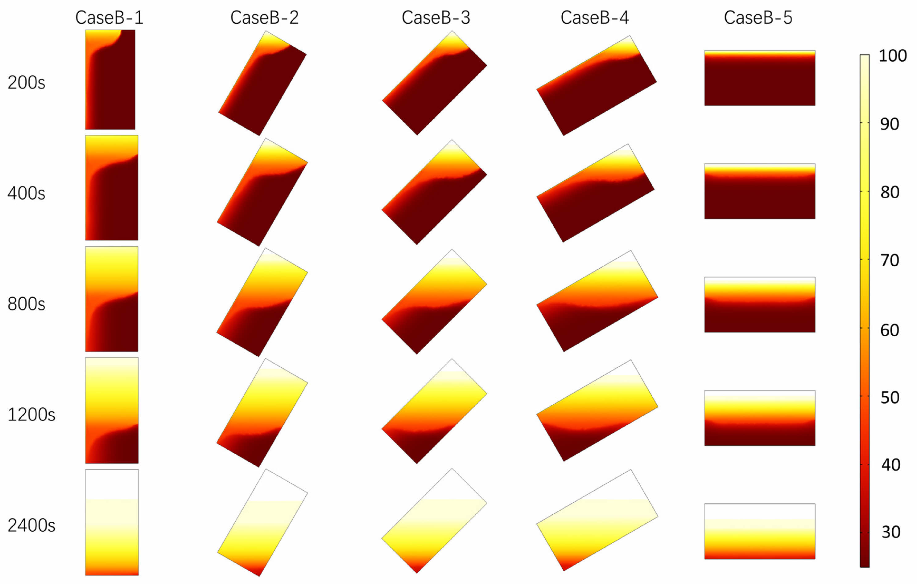 To visually illustrate the differences in melting processes among various cases, Figs. 5 and 6 present the melting distribution and temperature field distribution, respectively, of PCTES units with different inclination angles under a 4000W heating surface. Figure 5 delineates the melting distribution at 0°, 30°, 45°, 60°, and 90° inclination angles at specific time intervals of 200s, 400s, 800s, 1200s, and 2400s. In this representation, red denotes the liquid paraffin phase, while blue represents the solid paraffin phase. Overall, as time progresses, the melting process advances in all PCTES units. Specifically, in Case B-1, the phase interface exhibits a funnel-like shape, with faster melting occurring at the top and slower melting at the bottom, resulting in a steep phase interface gradient. As the melting process continues, the upper region fully melts, leaving a refractory area at the bottom. Compared to Case B-1, Cases B-2, B-3, B-4, and B-5 exhibit increased melting rates at the top as the inclination angle increases, leading to a gradual reduction in the phase interface slope and a corresponding decrease in the size of the refractory area. In Case B-5, the melting is relatively uniform, with almost no refractory area present. At 2400s, the refractory area, if any, appears triangular and decreases in size as the inclination angle decreases. This is attributed to the enhanced natural convection effect with increasing inclination, which increases the contact area between the hot and cold phases, improving the overall efficiency of the PCTES unit. In summary, in the high-inclination device, the direction of gravity is perpendicular to the heating surface. The natural convection is mainly vertical upward flow. The liquid PCM forms regular laminar vortices near the heating surface, enhancing the advancement of the melting front at the top. The low-inclination convection path extends horizontally, and the liquid PCM accumulates at the top of the heating surface to form a thermal stratification. The top melts too quickly while the bottom melts lagging behind, resulting in a prolonged melting time.