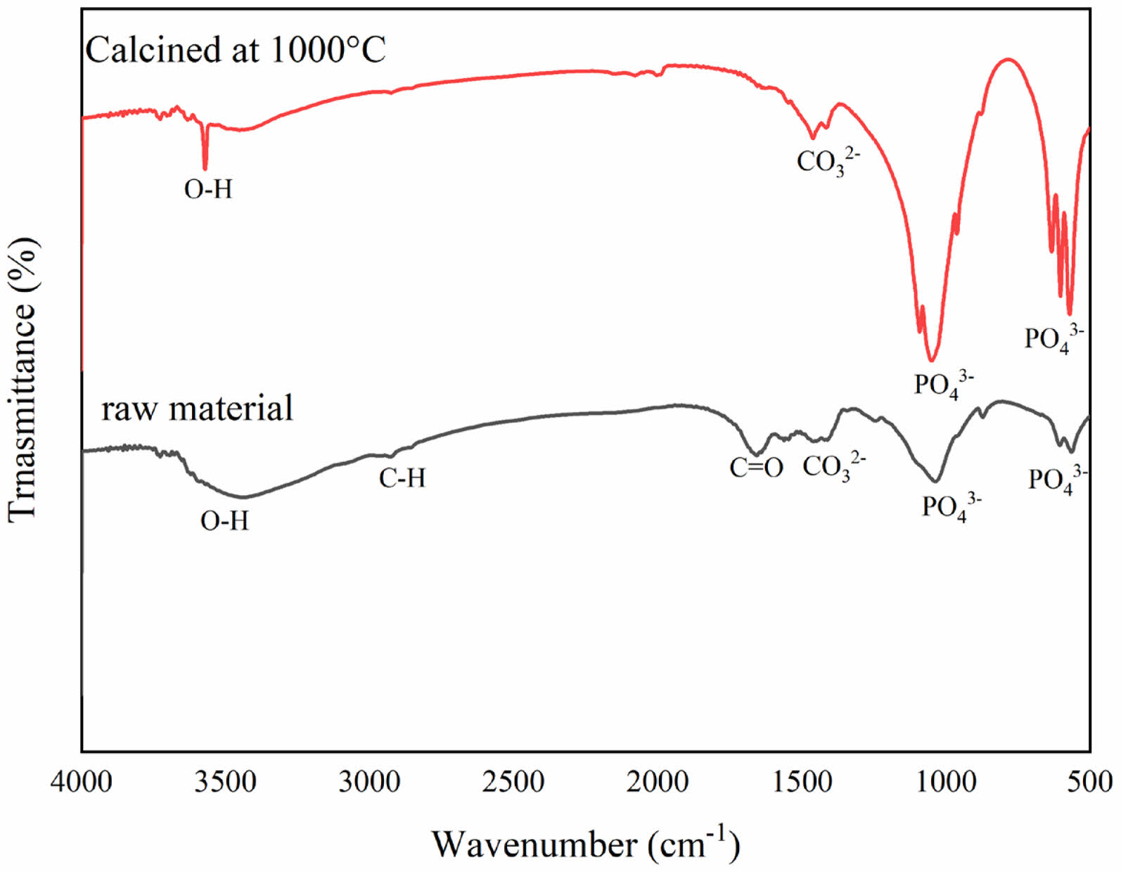 Figure 2 shows the FTIR spectrum of raw material and calcined at 1000 °C. Functional group analysis qualitatively identifies the components of buffalo bone through transmission absorption generated by FTIR. The raw material spectrum shows numerous and complex peaks, indicating the presence of various organic components within the bone.