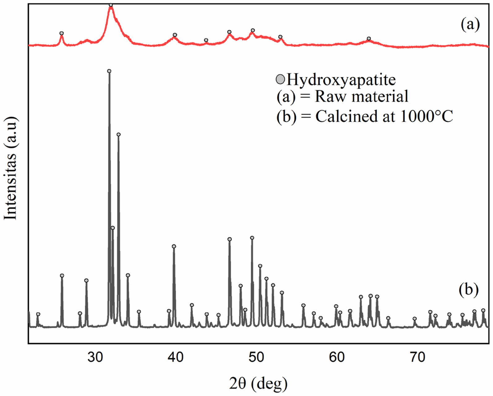 This finding aligns with the current study, where phosphate groups are detected at 1035 cm-1 for uncalcined bone powder and 1048 cm-1 for calcined bone powder. The presence of carbonate groups in the sample is not a negative feature, as human bones naturally contain carbonate elements that substitute for phosphate groups. Fig. 3 presents the X-ray diffraction patterns for raw material and material calcined at 1000 °C. Before calcination, the bone powder naturally contains hydroxyapatite within its mineral matrix.