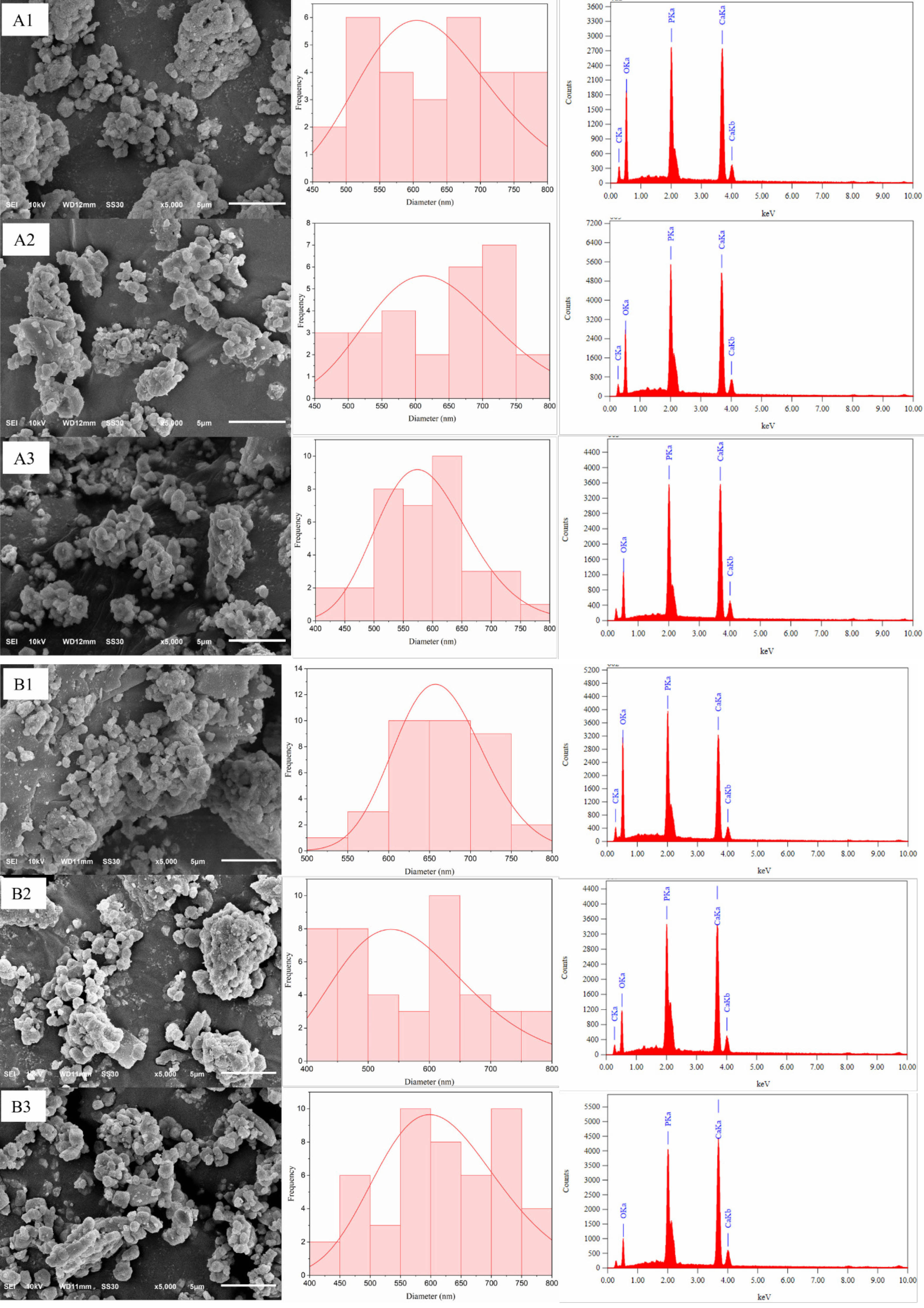 Fig. 6 Morphology, particle distribution, and EDX analysis of (A1) CHA-12-120, (A2) CHA-12-160 and (A3) CHA-12-200 with 12 hours of aging.  |