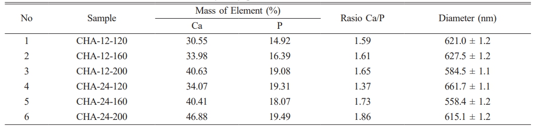 Figure 6b shows the morphology, particle distribution, and EDX analysis of CHA samples aged for 24 hours. The sample synthesized at 120 °C (CHA-24-120) has a heterogeneous surface with grains and clusters of small to medium sizes, along with noticeable agglomerates. The grains are irregular in shape, indicating incomplete or unstable crystallization at this lower temperature. At 160 °C (CHA-24-160), the surface morphology is smoother and more uniform than the sample synthesized at 120 °C, with more homogeneous grain sizes and fewer large agglomerates. This suggests enhanced crystallization and grain growth at 160 °C, as grains exhibit a more rounded and regular morphology, indicative of improved crystal quality. The CHA-24-200 sample synthesized at 200 °C displays the most uniform and compact morphology among the three samples, with a very smooth surface, more minor and uniformly distributed grains, and a high degree of homogeneity, reflecting optimal crystallization and material densification at this elevated temperature. Table 4 presents the particle size of the samples and the EDX analysis results, which will be used to calculate the Ca/P ratio of carbonated hydroxyapatite. The table indicates that the sample closest to the bone ratio is CHA-24-160, with a Ca/P ratio of 1.73 [2, 38, 39]. This value is remarkably close to the Ca/P ratio found in natural bone, which typically ranges from 1.67-1.71. This optimal Ca/P ratio has significant implications for its biological performance. A material with a Ca/P ratio closely mimicking natural bone is expected to exhibit superior biocompatibility, as it is more readily recognized and integrated by the host physiological system. Furthermore, such a ratio is crucial for enhanced osteoconductivity, facilitating the direct growth of new bone onto the materials surface. Therefore, the CHA-24-160 sample is considered the most biomimetically suitable composition among the synthesized materials.