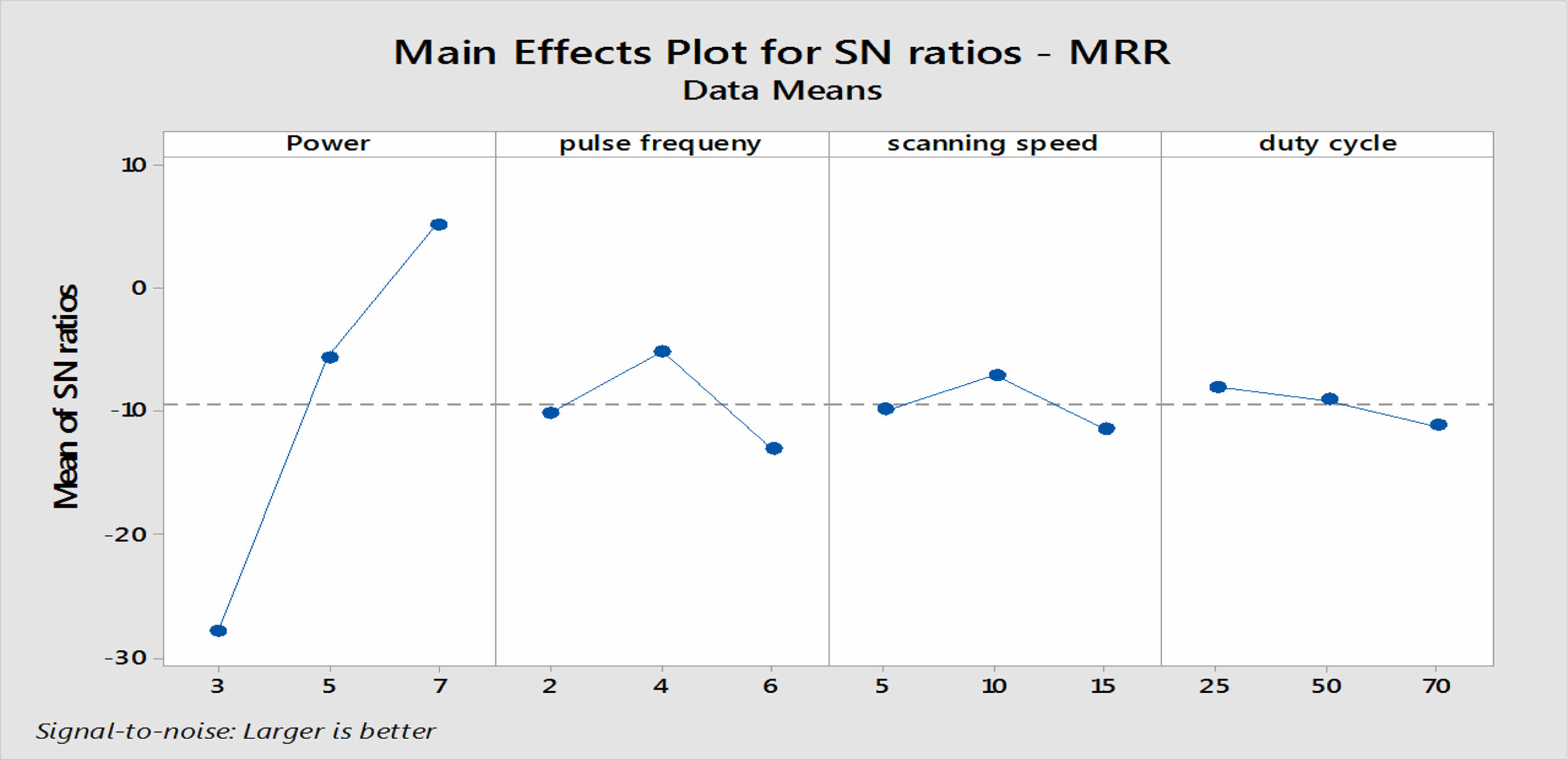 In this observation of FLMM machining when the MRR increases with increases in the quantity of power applied. In Fig. 3 the MRR vertically increasing trend of S-N ratio from 3W to 7 W, the relationship between pulse frequency and S-N ratio shows that initially increases and mid decreasing trend for frequency from 2 KHz to 6 KHz and similarly speed of scanning from 5 to10 mm/s. The plot of duty cycle shown a decrement in Signal - Noise Ratio from 25% to 70%. Regardless of quality characteristic when analyzing the Signal - Noise Ratio and larger Signal - Noise Ratio concerning the better value in the results of experiments, in this case were achieved higher MRR.