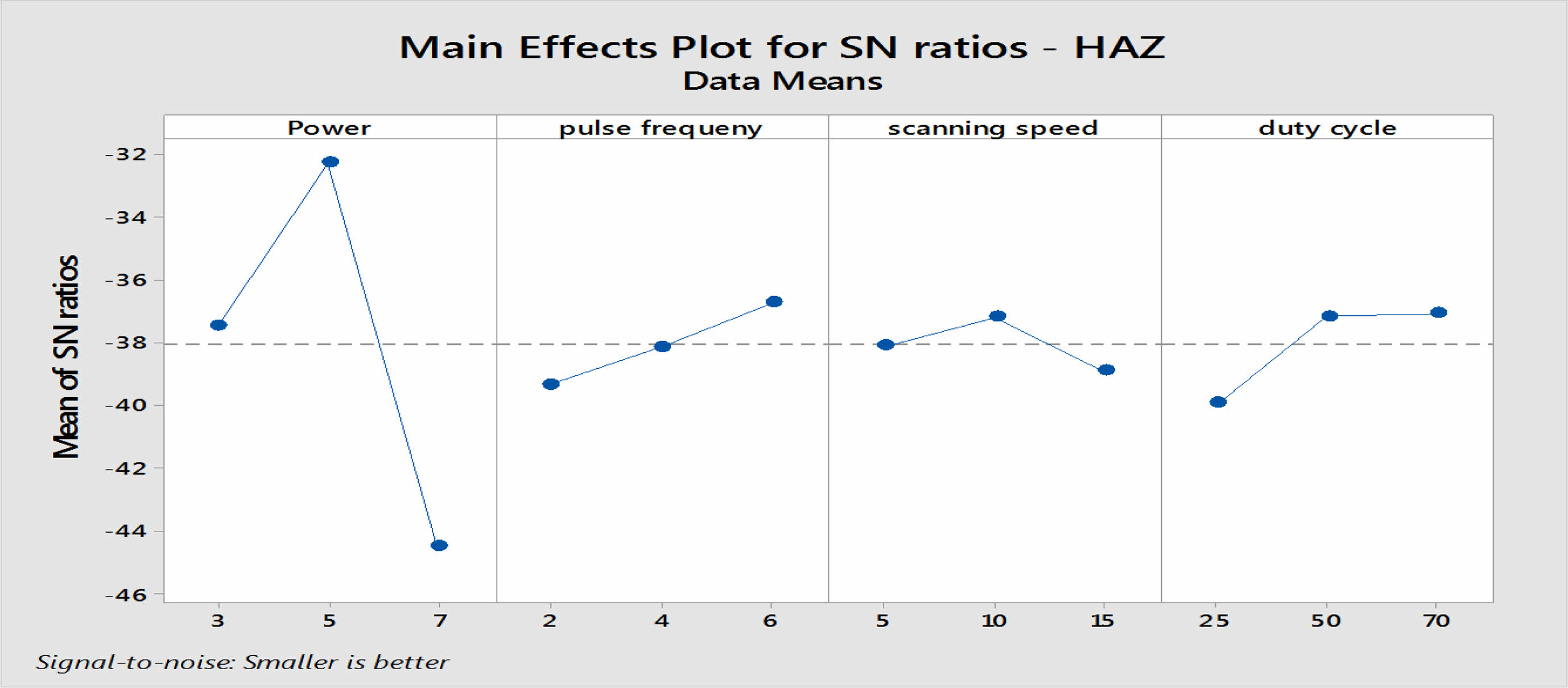 The heat affected zone and S-N ratio was calculated as presented in Table 6. In this analysis were used smaller - the –better method to check whether the considered effect factor. For the characteristics of the Taguchi method, a response Table 9 shows that S-N ratio of HAZ is generated. The results shown that the applied delta Power of 12.21 had the greatest effect on HAZ, duty cycle of 2.87 and followed by pulse frequency and Scanning speed with delta 2.60 and 1.70, respectively. Response table for the Signal - Noise Ratios are used to illustrate the main effects plot of HAZ, as shown in Fig. 5. Again, the most influence factor is power as the S-N ratio increases the power till the mid and decreases that the power increases. In the case of duty cycle sudden increase in trend of S-N ratio for HAZ from 25% to 50% and the ratio decreases slightly between 50% to 70%, shown in Fig. 5 in addition the frequency, the delta statistics in Table 9 shows that HAZ is mainly affected by the Power, duty cycle followed by the frequency and scanning speed.