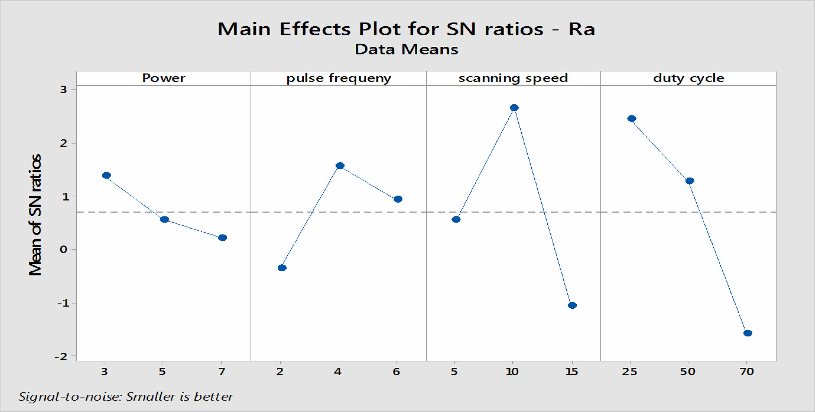 The experimental data and S-N ratios of surface roughness was calculated as shown Table 6. The Signal - Noise Ratios of Ra responses, delta ranks were generated as shown in Table 11. The most influencing factor of surface roughness is duty cycle with delta value 4.0152, and scanning speed 3.7029 followed by frequency 1.9179 and power 1.1512.