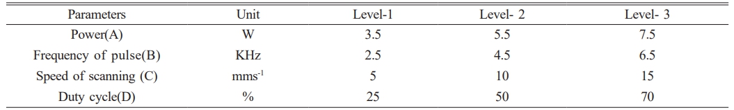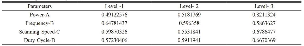 • Optimization of parameters by Grey Relationship Analysis is done and the optimal parameters are Power 7.5 W(A), Frequency of pulse 2.5 KHz.(B), Speed of scanning 15 mms-1 (C), Duty cycle 70% (D)