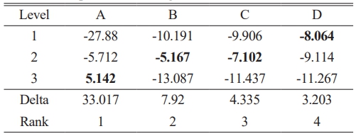 The calculated values of MRR are presented in Table 6. Transformed as S-N ratio by Minitab software. The delta statistics shows the dominant control factor using S-N Ratio. The delta statistics are calculated with respect to the difference among highest value and lowest value of each factor. Ranking was determined by the values of delta and the parameter with higher delta value is placed in the first rank, also the dominant factor affecting MRR. Table 7 shows Response table for Signal - Noise Ratio of MRR.