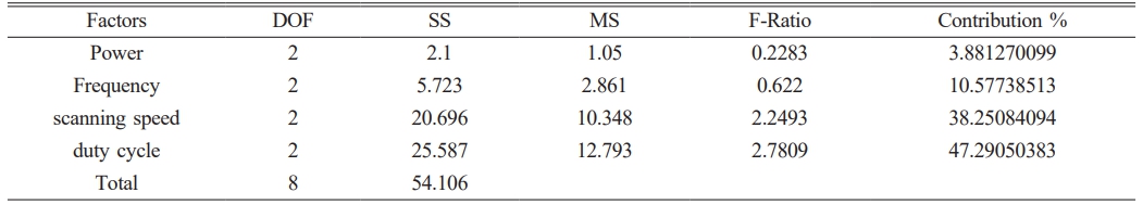 Subsequently, significant factors and percentage Fcontribution of each factor was carried out and tabulated (Table 10) which shows that Power has the highest contribution as 88.11% followed by duty cycle 6.22%, frequency of 3.965 % and scanning speed 1.697%.