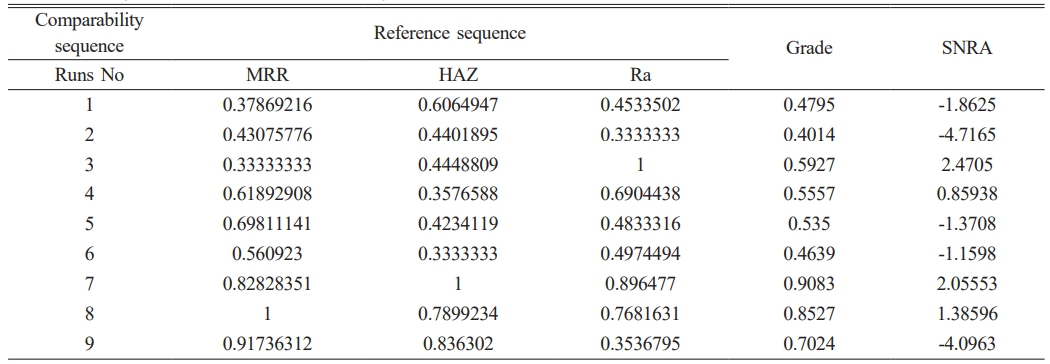 The values of MRR, HAZ and Ra are defined as the sequence of reference x0(0)(k), k = 1–3. In addition, the nine experiments are the sequences for comparability xi*(k), i = 1, 2 ... 9, k = 1-3. The sequences of data pre-processing is implemented using equation (3, 4) as shown Table 13. The reference and comparability sequences are defined as x0*(k) and xi* (k), respectively. The deviation of ∇oi, ∇oi  max(k) and ∇oi  min(k) for i = 1–9, k = 1-3 can also be evaluated. The deviation sequences ∆01 (1) can be evaluated as: