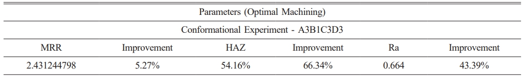 Once the optimal setting is decided, then the last step of GRA is to anticipate and establish performance improvements. The confirmatory tests performed to validate the analysis results and the values are presented in Table 18. The improvement of the experimental results When compared to the highest of OA responsesconfirms the validity of the Taguchi method combined with GRA to improve the Micro Machining of the Dual Phase SS 201.