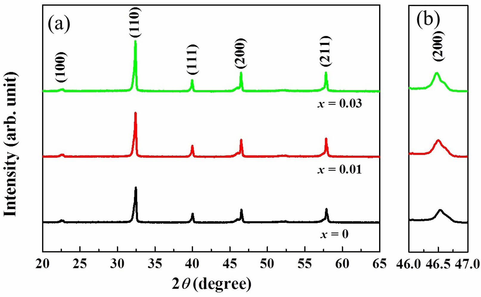 Fig. 1 (a) XRD patterns of BNT-ST-xKN (x=0.01-0.03) ceramics. (b) Enlarged XRD patterns show an unchanged pseudocubic structure regardless the increasing x.  |