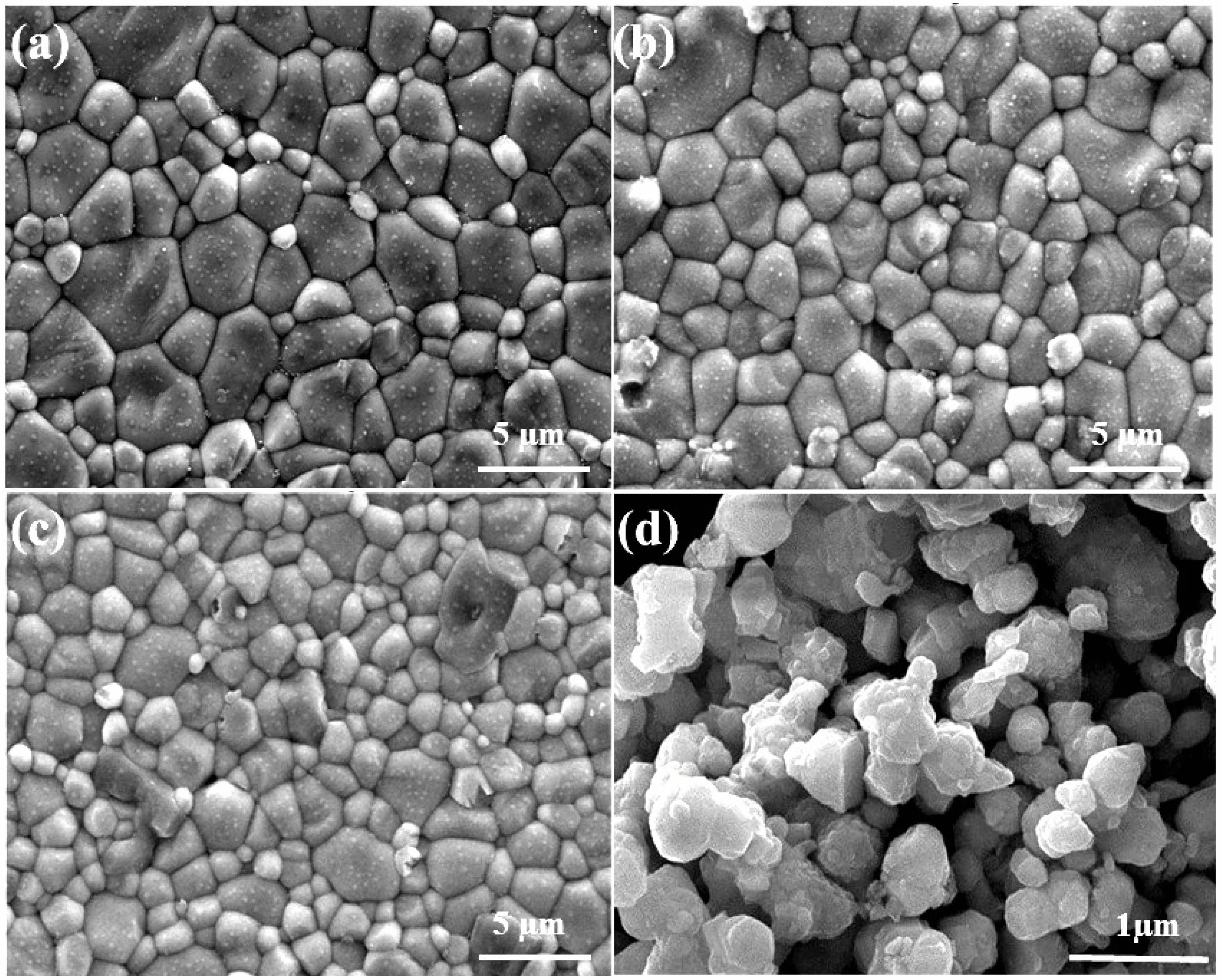 Fig. 2 SEM micrographs of the BNT-ST- xKN ceramics sintered at 1150 for 2h: (a) x=0 (b) x=0.01 (c) x=0.03. (d) calcined powder (x=0.01) after sieving  |