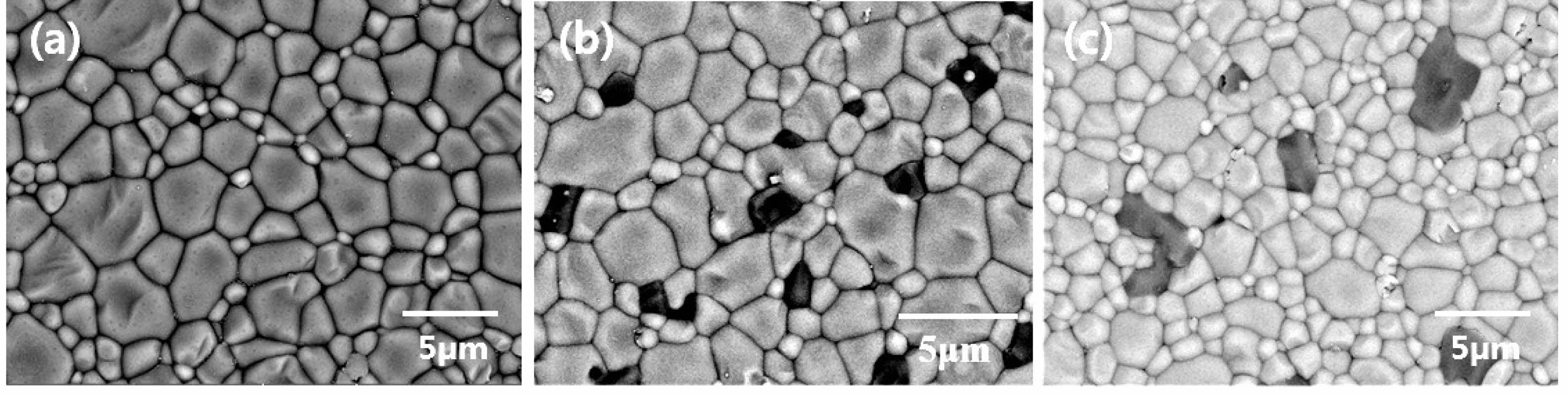 Fig. 6 BSE images observed on the surface of the BNT-ST-xKN specimen (a) x=0 (b) x=0.01 (c) x=0.03.  |