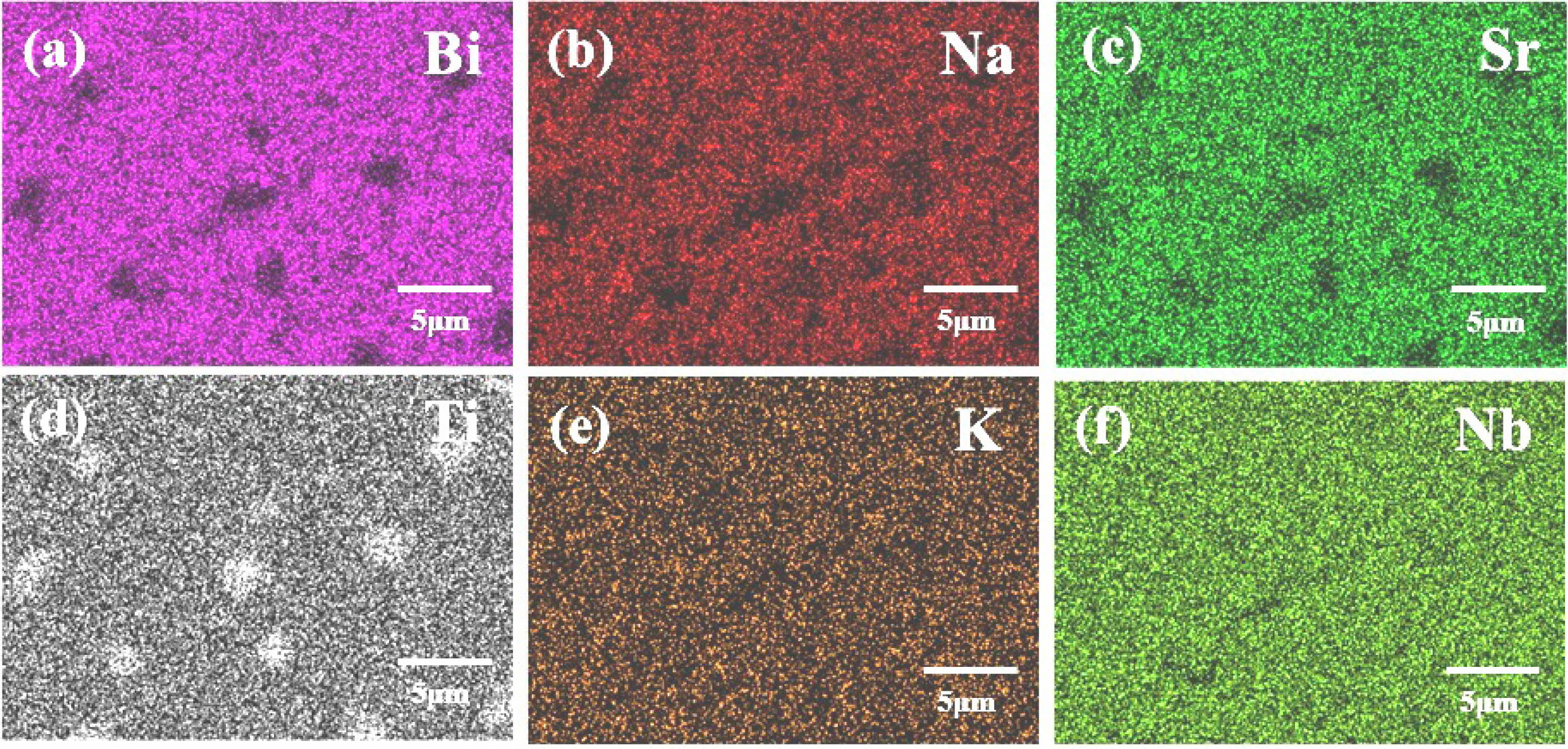 Fig. 7 EDX mapping images of the BNT-ST-0.01KN specimen (a) Bi (b) Na (c) Sr (d) Ti (e) K (f) Nb.  |