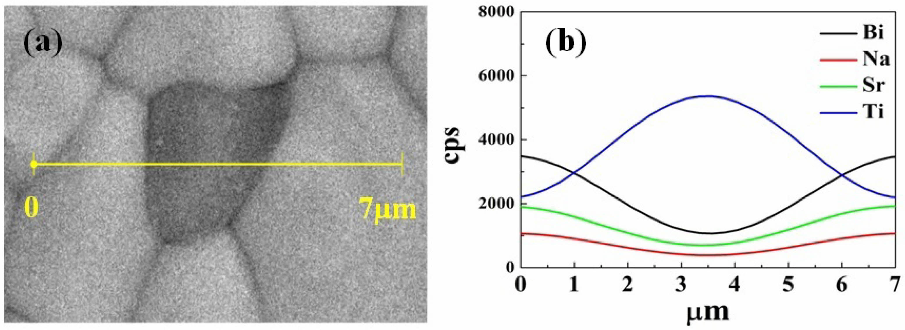 Unlike BNT-BT and BNT-BKT ceramic systems, where the coexistence of different phase structures are attributable to the enhanced piezoresponses, most researchers agree that the high strain characteristic in the BNT-ST system is associated with the F-R phase transition [3, 15, 18-20, 35]. The F-R phase transition was reported as not strictly related to changes in the lattice symmetry but rather involving a state of local chemical inhomogeneity [39-41]. Here, we examined the distribution of constituent elements on the surfaces of ceramic pellets by FE-SEM via the BSE mode and EDX mapping. Fig. 6 shows the result of BSE analyses of samples with different KN contents. There are no differences in the colors among the grains over the surface of the specimen for which x=0, as shown in Fig. 6a. In other words, all of the constituent elements are uniformly distributed within the entire ceramic material. Whereas at x=0.01, single dark-colored grains can be observed within the brightly colored grain matrix (Fig. 6b). These dark grains tend to merge into large subgroups of several grains when increasing KN further to x=0.03 (Fig. 6c). These changes indicate that the presence of KN caused a non-uniform distribution of the constituent elements (known as local chemical inhomogeneity) in the ceramics. Moreover, it was noted that the higher the content of KN, the greater the difference in the element distribution. The EDX mapping result in Fig. 7 shows that the expected elements of Bi, Na, Sr, Ti, K and Nb were detected on the BNT-ST-0.01KN sample shown in Fig. 6b. While K and Nb appear to be quite uniform over the entire area (Figs. 7e and f), Fig. 7d, however, indicates the aggregation of Ti, which results in the dark-colored grains in Fig. 6. On the other hand, Bi, Na, and Sr are present on the ceramic surface, except at the areas occupied by Ti, suggesting that these elements exist in the brightly colored grain matrix shown in Fig. 6. Fig. 8 presents a EDX line scan that was employed to investigate the elemental distribution across a dark grain in Fig. 6. As is apparent in Fig. 8, Ti mainly dominates the entire grain, with a high concentration at the center part, whereas Bi, Na and Sr are found only in small amounts near the grain boundary. These results demonstrate local separation between the A-sites (Bi, Na and Sr) and B-sites (Ti) in the perovskite BNT-ST system, which must be associated with the opposite diffusion tendencies in the solid phase. It should also be noted that the local high concentration of Ti suggests the existence of titanium oxide (TiO2), which may have formed during the sintering process. As a natural semiconductor, TiO2 can provide charges to form a local field that may further influence the distribution and/or reorientation of ferroelectric domains [42], leading to a high strain and a low driving electric field.