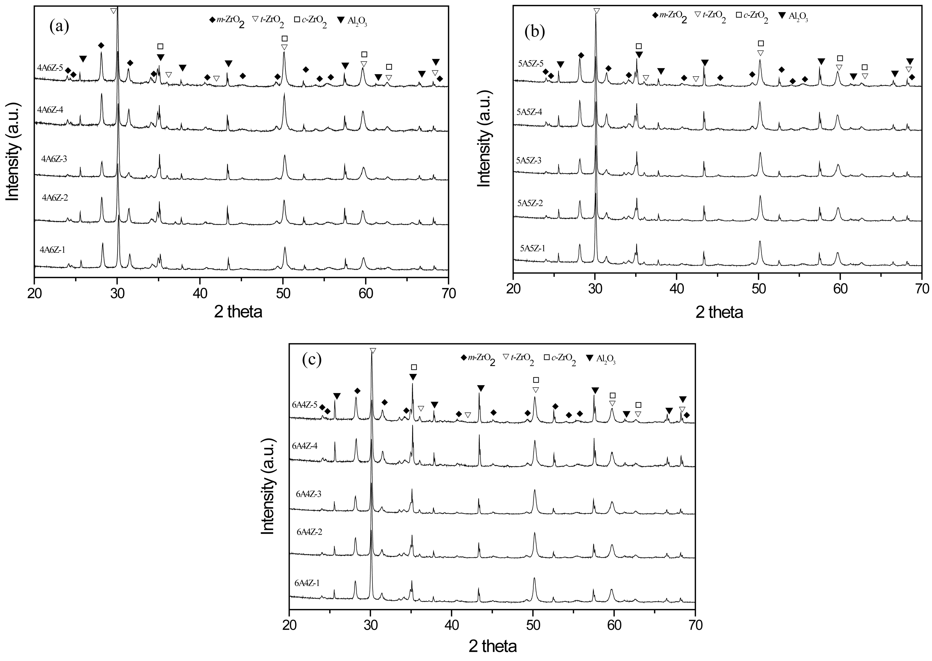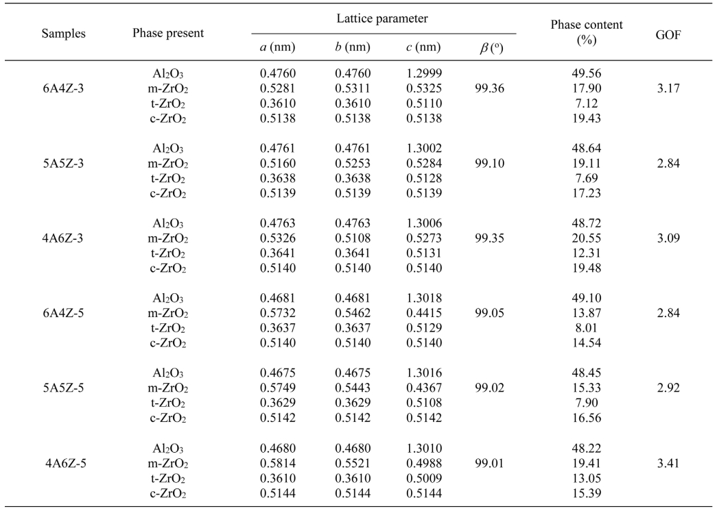 Al2O3-ZrO2 composite ceramic were used as matrix powders to which Al2O3 was added MgO 6.0 mol% to form AM and ZrO2 was added Y2O3, 4.0 mol% to form ZY. The powder of AM :ZY at 60:40, 50:50 and 60:40 ratios were mixed together in different content and then wet ball milled for 24 h. After ball-milling, drying in electronic furnaces and sieving with 120 mesh, the resulting powders were annealed at 1200 °C, with dwell times of 120 min and heating/cooling rates of 10 °C/min. The (100-x)AM-xZY composite powders (x=40, 50, 60) were then pressed at 3MPa to form pellets having 1.5 cm diameter using a hydraulic press and sintered in an alumina crucible under two stage sintering (TS) with three different conditions and normal sintering (NS) with two conditions according to our the previous research based on alumina zirconia materials [13, 20, 21]. The two stage sintering conditions were (TS-1) T1 temperature at 1600 °C for 30 min and T2 temperature at 1450 °C for 5 h, (TS-2) T1 temperature at 1600 °C for 30 min and T2 temperature at 1450 °C for 10 h, (TS-3) T1 temperature at 1650 oC for 30 min and T2 temperature at 1450 °C for 5 h. The normal sintering (NS-4) temperature at 1600 °C for 5 h, and (NS-5) temperature at 1650 °C for 5 h. The sintering experiments were carried out in an electrical furnace (Nabertherm, Germany). The bulk densities of sintered sample were calculated using Archimedes’ method. The phase composition was investigated by an X-ray powder diffraction using an X-ray diffractometer (Bruker model D8 advance). Quantitative phase analyses were performed by fitting the measured data using the Rietveld refinement method in TOPAS software. Microstructural analysis was performed by using Scanning Electron Microscopy (SEM) (JEOL JSM-840A) of sintered samples on a polished surface. The microhardness of the bulk ceramics was measured using a micro scan from Vickers and Knoop (FM- 700e type D, Future Tech., Japan).