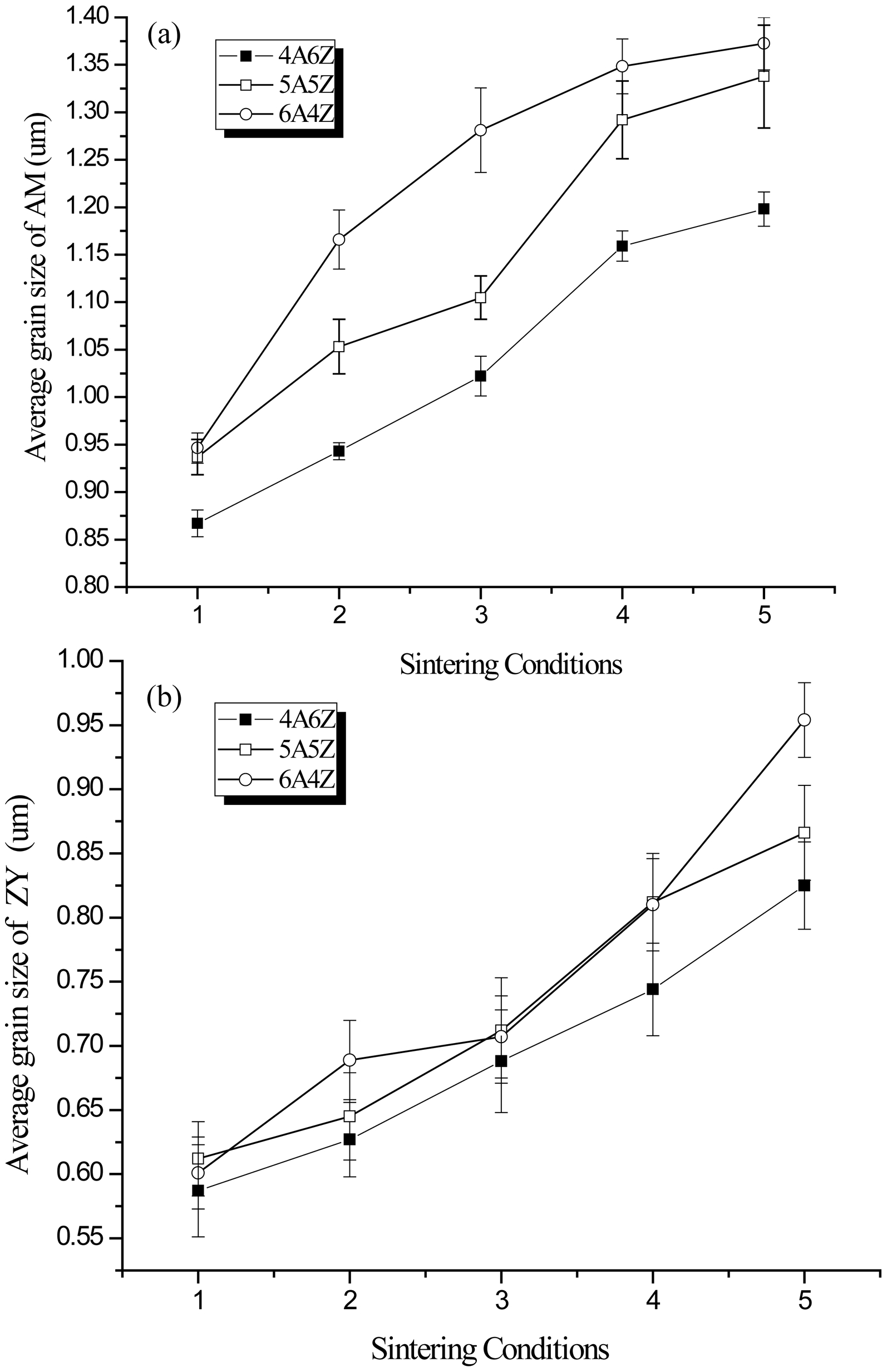 Fig. 3 The relationship between average grain sizes values and sintering conditions (a) AM (b) ZY. |