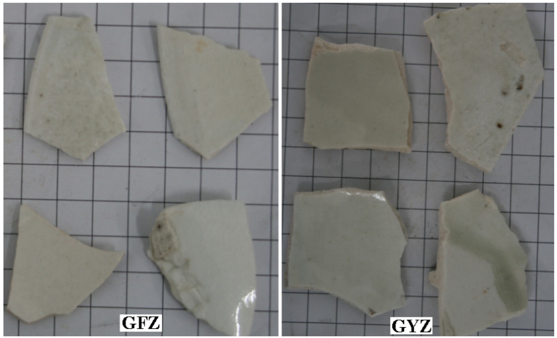The white porcelain specimens used in this study were collected from the Guifangzi (GFZ) and Gangyanzi (GYZ) kiln sites. Representative sherds are shown in Fig. 1.