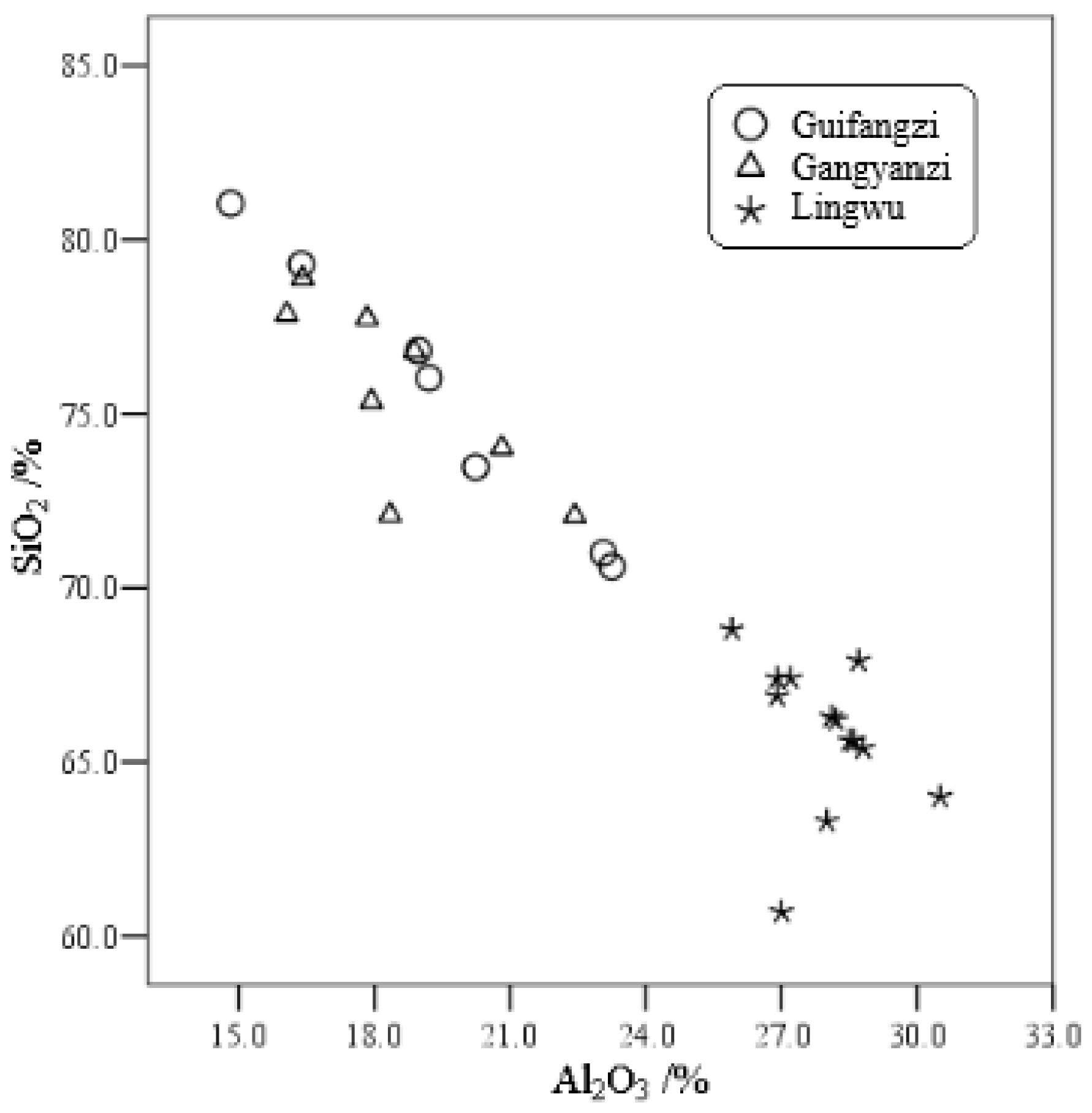 Fig. 2 Scattergram of SiO2 and Al2O3 content in white porcelain bodies from Guifangzi, Gangyanzi and Lingwu kilns. |