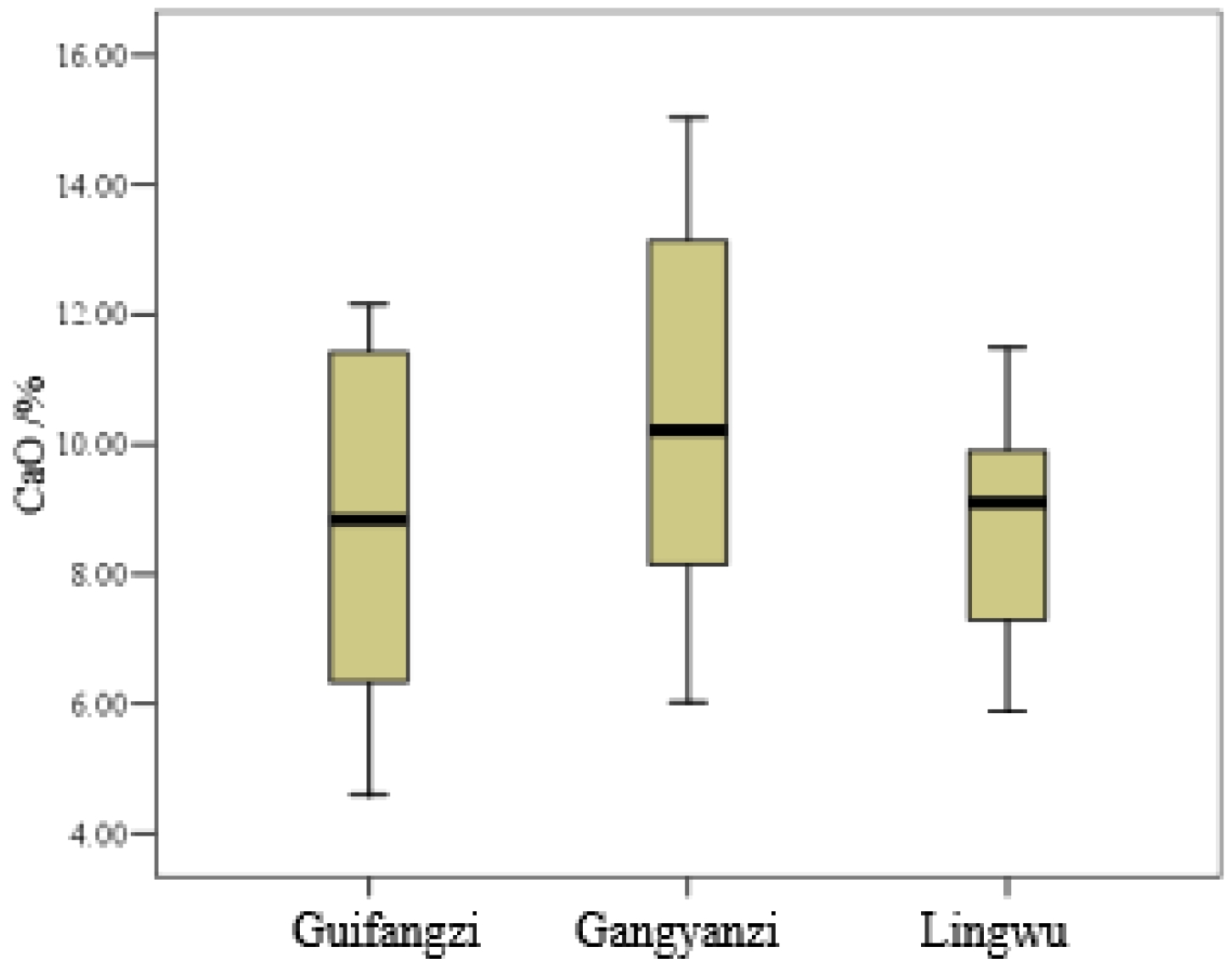 Fig. 5 Box plot of CaO content in white porcelain glaze of Guifangzi, Gangyanzi, and Lingwu kilns. |
