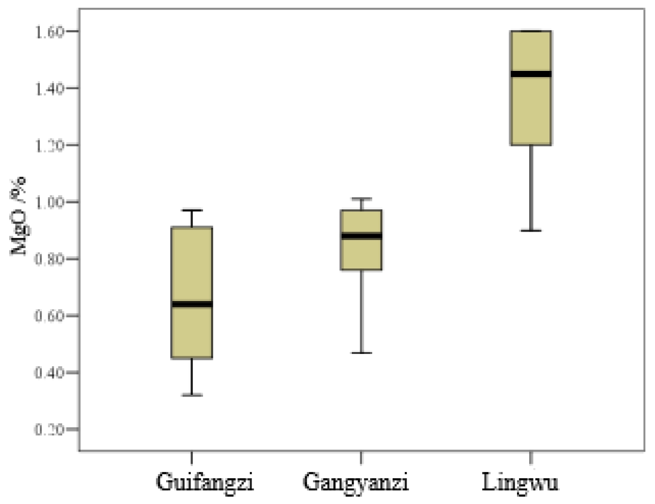 Fig. 6 Box plot of MgO content in white porcelain glaze of Guifangzi, Gangyanzi, and Lingwu kilns. |