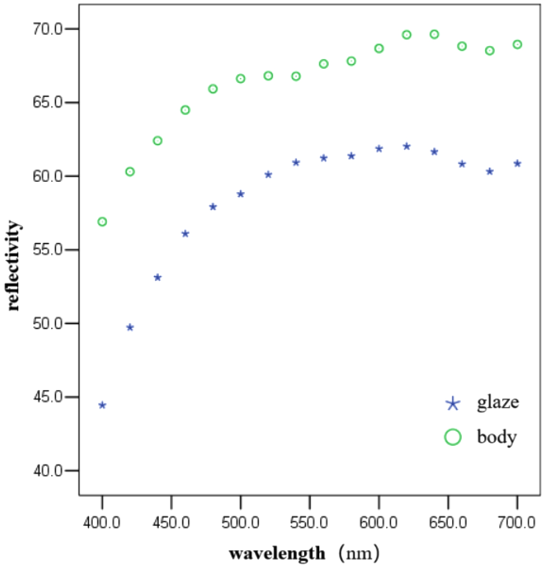 The whiteness of the glaze surface is slightly lower, averaging around 64, which is comparable to that of white porcelain produced at the Ding and Dehua kilns [17]. As shown in Figure 7, the reflectance spectrum of sample GFZ-2 indicates that the porcelain body reflects more than 65% of visible light, while the glaze reflects slightly less, typically between 55% and 60%. This slight difference in whiteness can be attributed to the use of transparent glazes on the Guifangzi and Gangyanzi wares. In general, as the thickness of the glaze layer increases, light transmittance and absorption are enhanced, while reflectance and scattering are reduced, thereby lowering the apparent whiteness of the glaze surface.