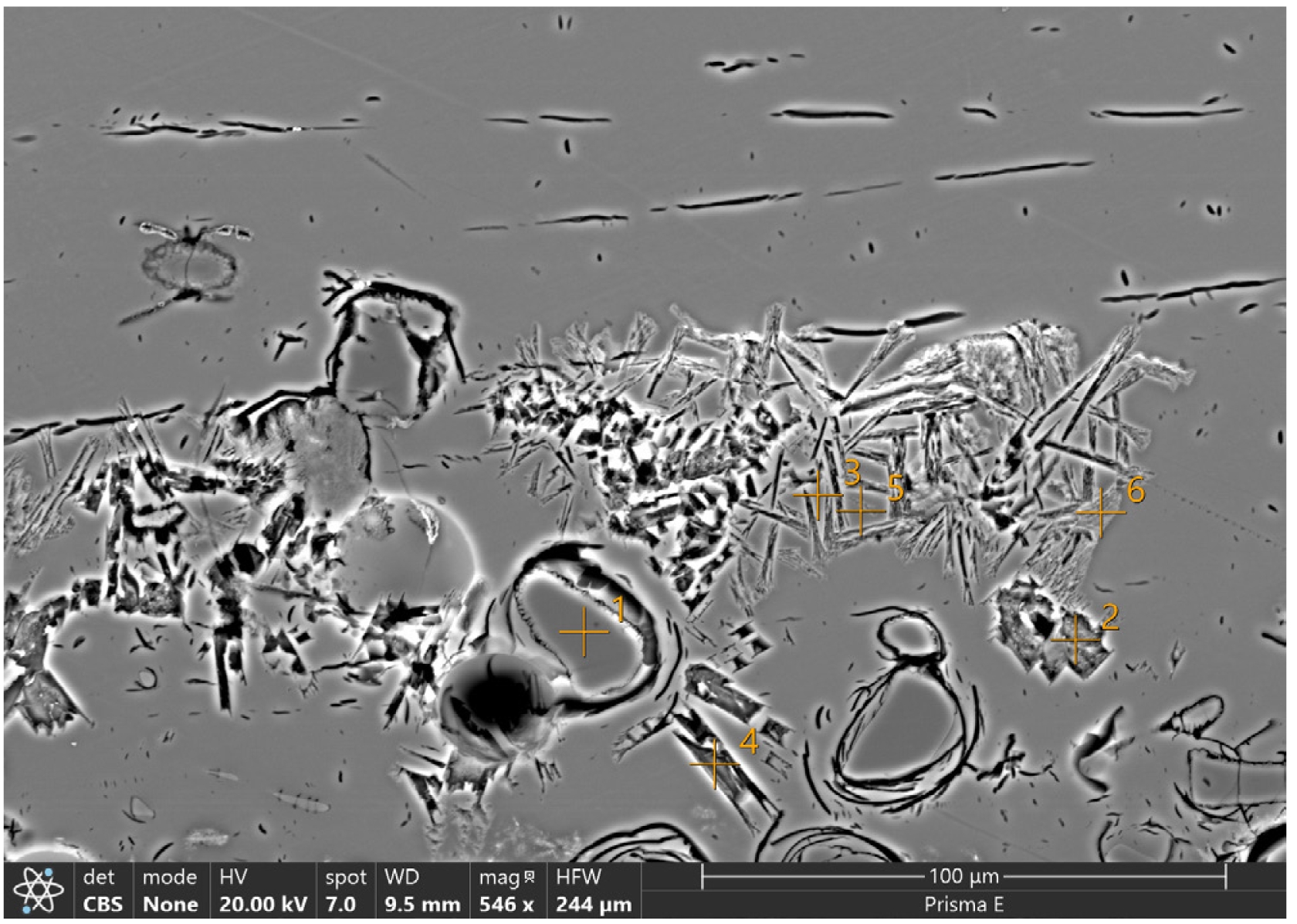 Figs. 8 and 9 present the microstructures of the glaze-body interface of sample GFZ-2 and the porcelain body of sample GYZ-8, respectively. The glaze layer of the analyzed white porcelain appears relatively pure, with few residual crystals and minimal porosity. At the glaze-body interface, needle-shaped crystals are observed (e.g., in positions 3, 5, and 6 in Fig. 8). Energy-dispersive spectroscopy (EDS) indicates that these needle-shaped crystals are mainly composed of Si, Al, O, and Ca, suggesting they are likely anorthite.