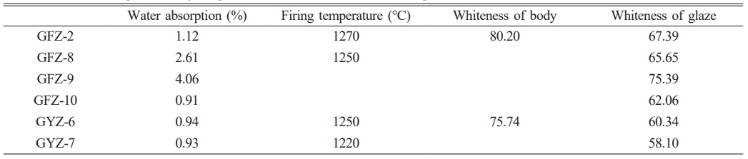 Table 1 Composition of primary and secondary elements (%) in the body of white porcelain samples excavated from the Guifangzi and Gangyanzi kiln sites (%). |