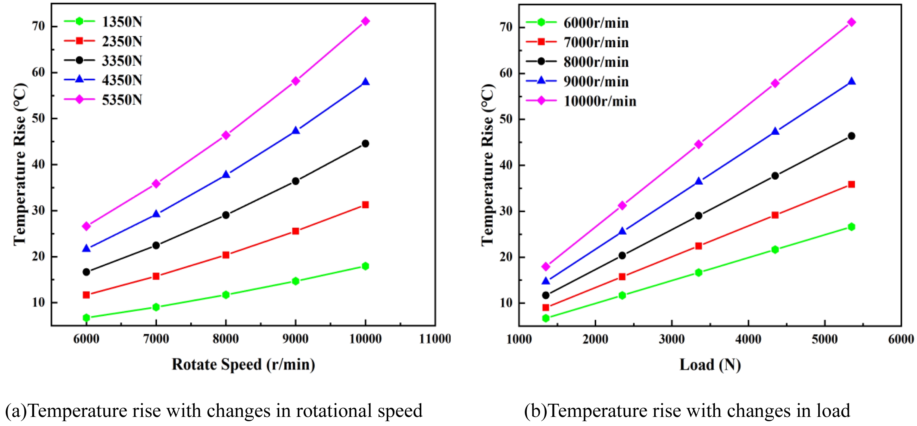 Figure 3(a) uses rotational speed as the horizontal axis and temperature rise as the vertical axis. Different color curves correspond to different loads (1350N–5350N), showing that as the rotational speed increases, the temperature rise increases for all loads, with a more significant temperature rise at higher loads (e.g., 5350N). Fig. 3(b) uses load as the horizontal axis and temperature rise as the vertical axis. Different color curves correspond to different rotational speeds (6000 r/min–10000 r/min), indicating that as the load increases, the temperature also rises at all speeds, with a greater temperature rise at higher speeds (e.g., 10000 r/min). Based on the simulation results for the 6206 silicon nitride full ceramic ball bearing, the temperature rise characteristics of this bearing can be summarized as follows: Rotational speed is the most sensitive factor influencing the temperature rise, with load being secondary. Under constant load, the temperature rise increases sharply as the speed increases (e.g., at 8000 r/min, the temperature rise can exceed 60 °C). Under constant speed, the temperature rise increases with the load, but the increase is slower. Other input parameters for the simulation, except for load and speed, are shown in Table 1.
