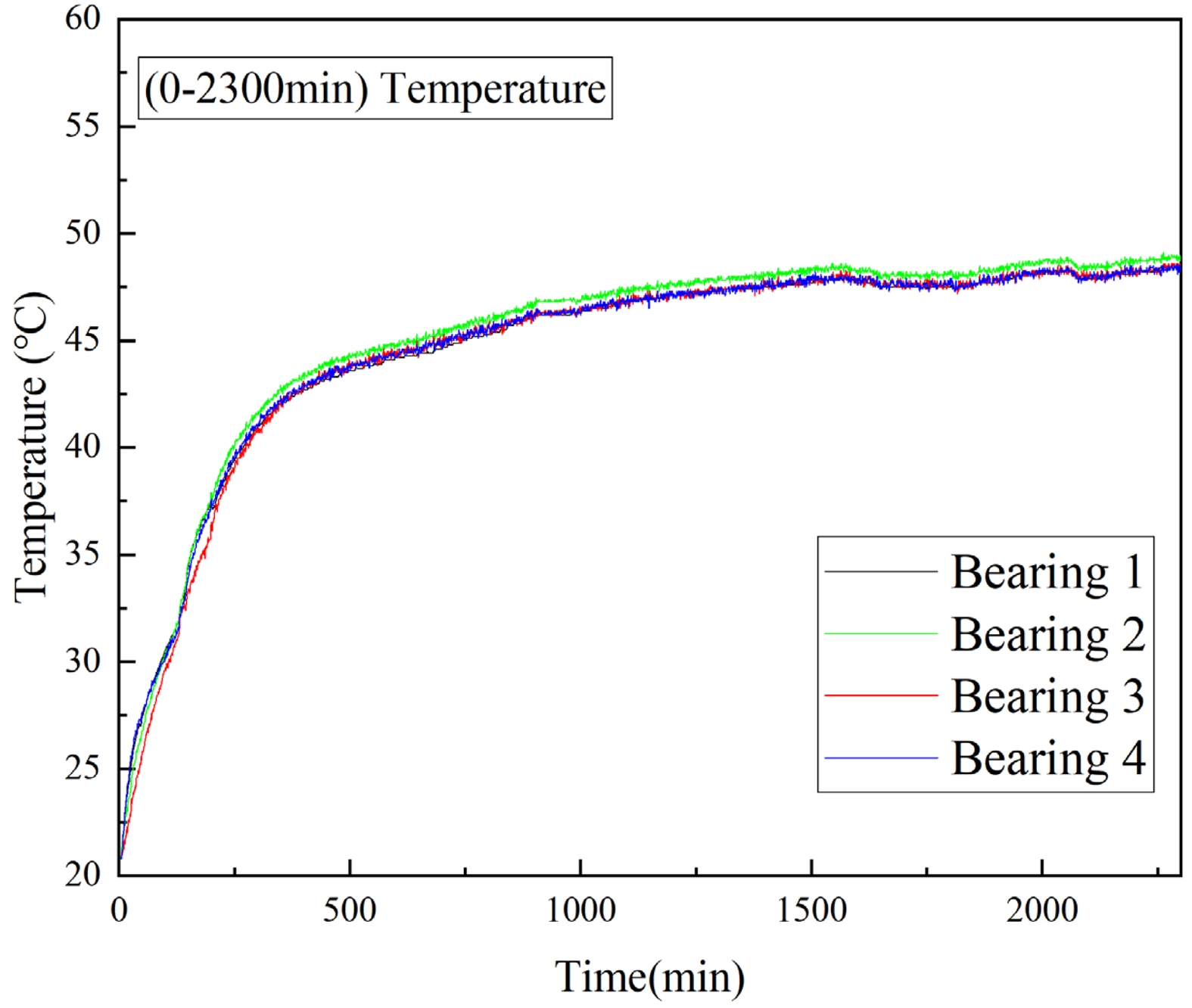 The bearings in the test assembly were numbered from right to left as Bearings 1 to 4, and then installed into bearing seats 1 through 3 in sequence. The assembled bearing unit was mounted into a custom bearing housing and placed in a sealed test chamber. The primary purpose of this test was to apply a radial load to the bearings. Since no axial load was applied, Bearings 1 through 4 all functioned as test bearings. In this experiment, temperature data were collected once per minute for each bearing.