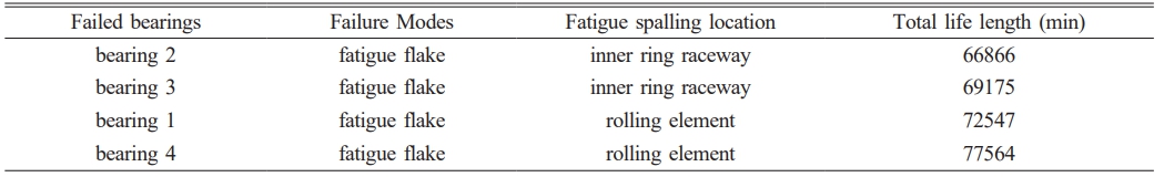 Since the primary focus of this full life bearing test was the steady-state temperature throughout the entire operation process, the test was concluded when Bearing 2 failed and caused the testing machine to shut down. Disassembly and inspection of the bearing after failure would lead to temperature fluctuations (e.g., a drop), making it impossible to connect the data before and after shutdown. Therefore, the test data were analyzed only up to the point of failure of Bearing 2. Prior to the shutdown, the average temperatures of the four test bearings were 47.81 °C, 48.33 °C, 47.92 °C, and 47.98 °C, respectively. Except for the failed Bearing 2, the temperature differences among the other three bearings were within approximately 0.2 °C, indicating stable thermal performance of the full ceramic bearings. The time to failure and shutdown caused by spalling in the test bearings is shown in Table 2.